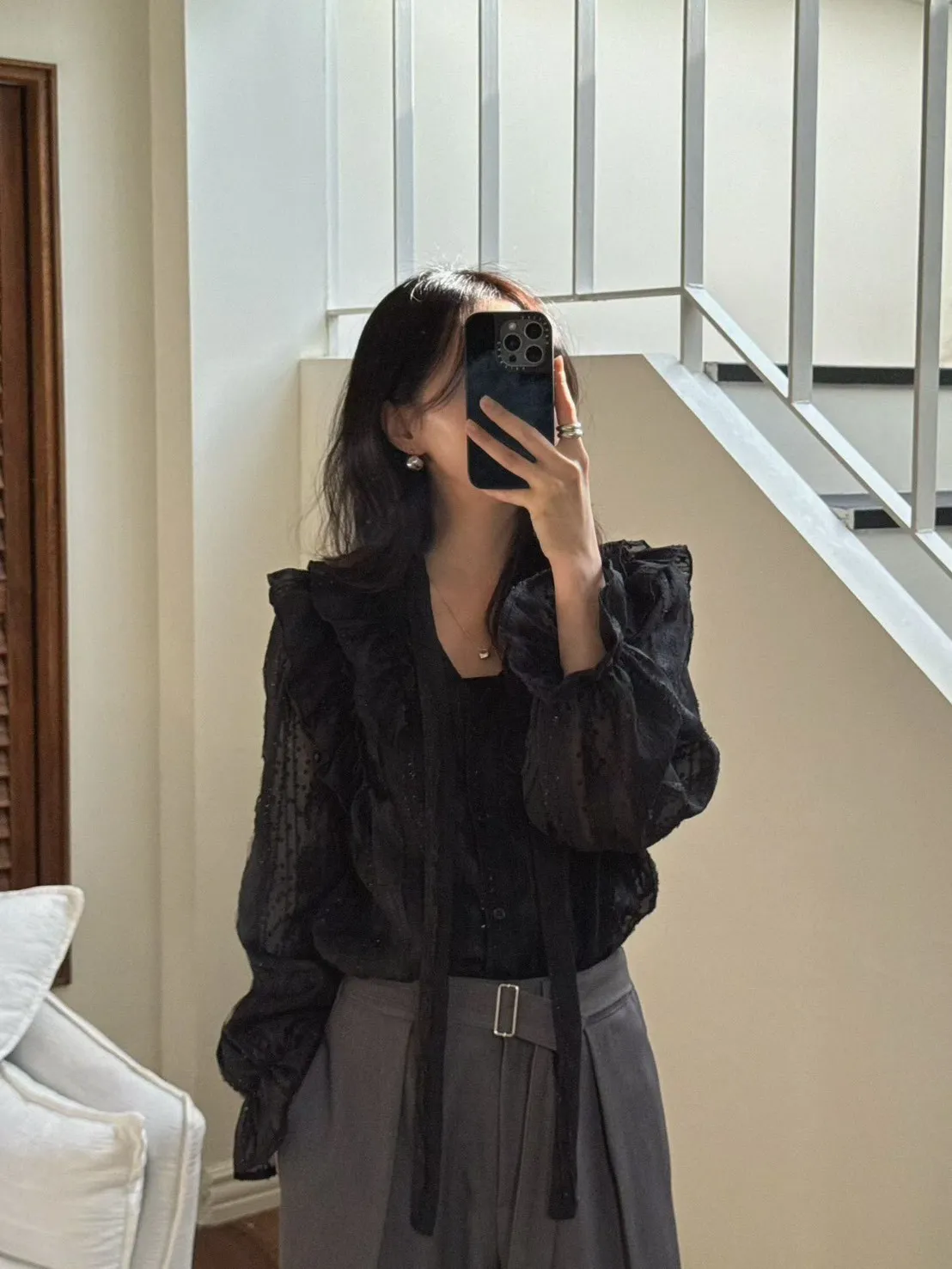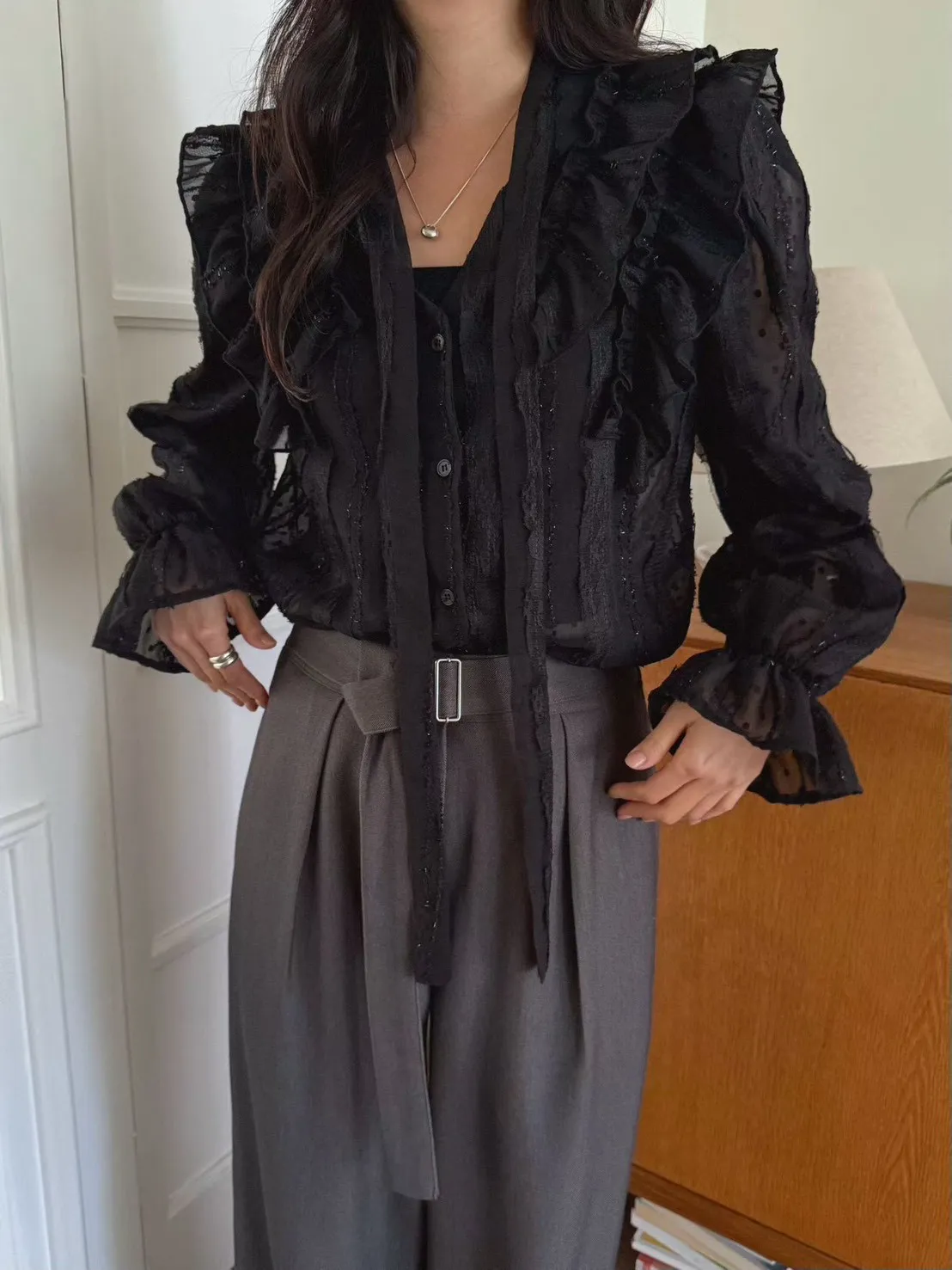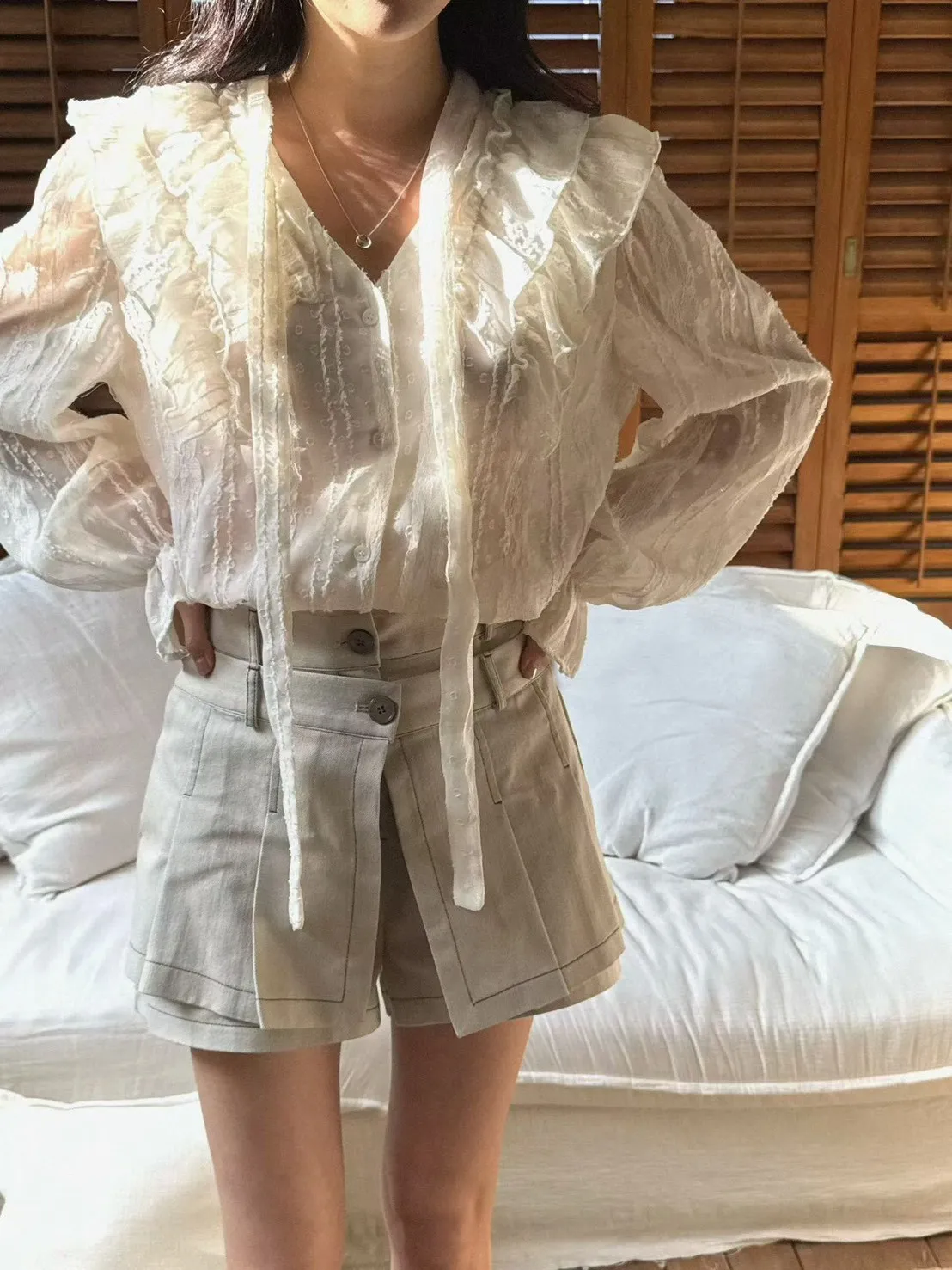 A35 0326素希歐膩家點點蕾絲綁帶V領雪紡襯衫2色