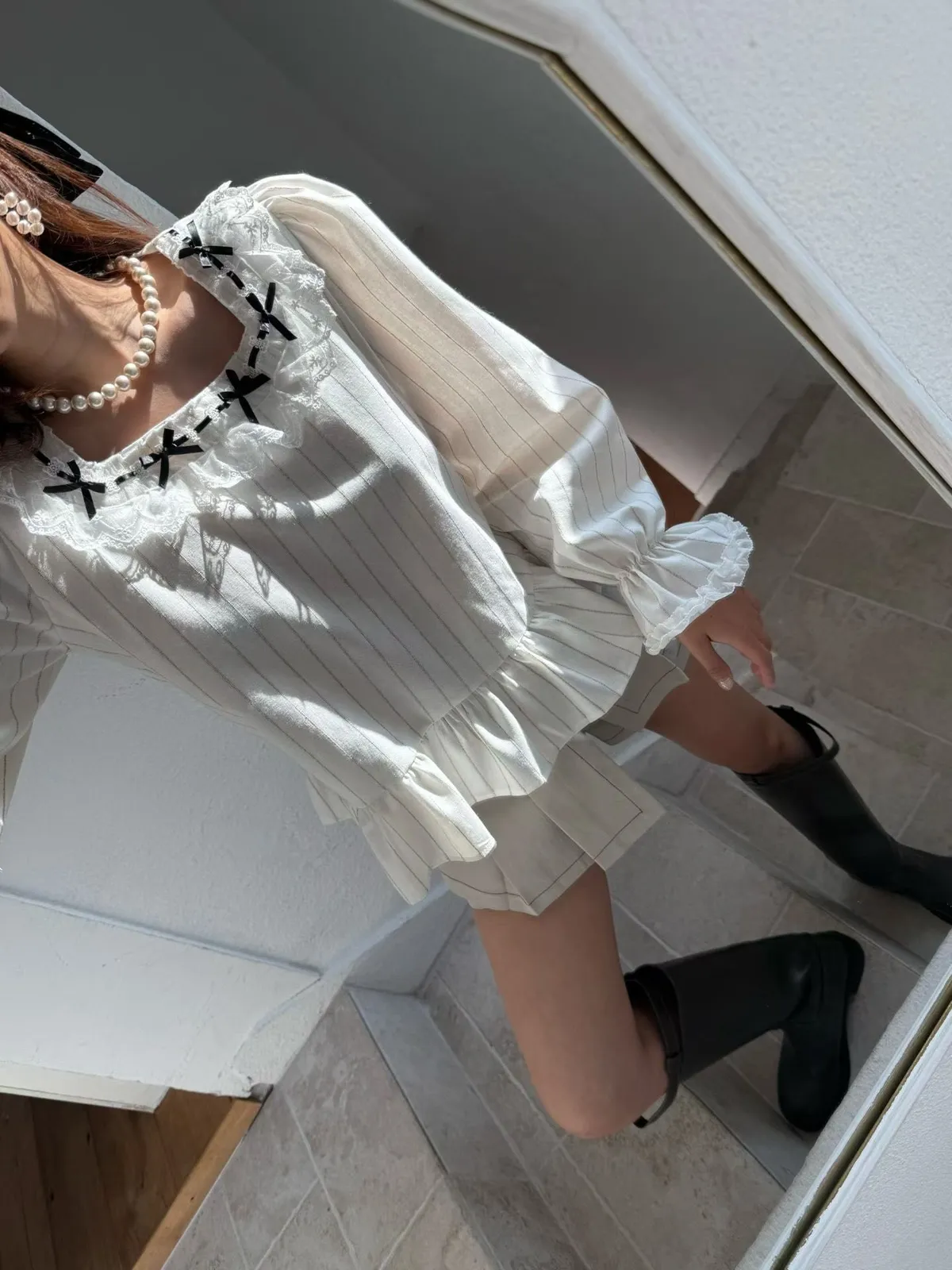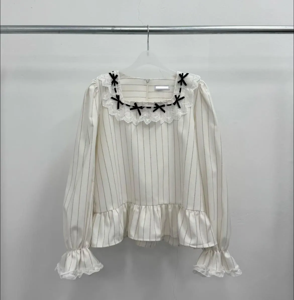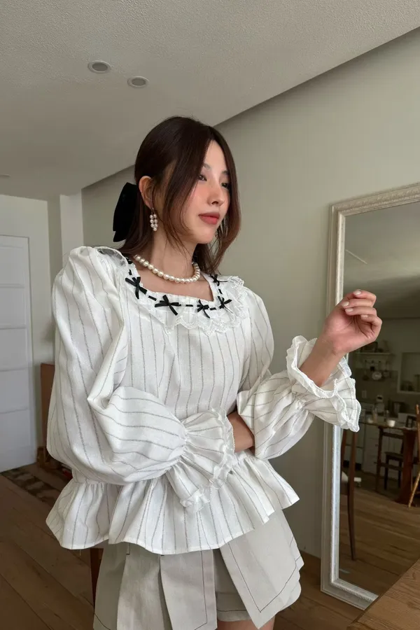 B157素希歐膩方領蝴蝶結拼接蕾絲上衣