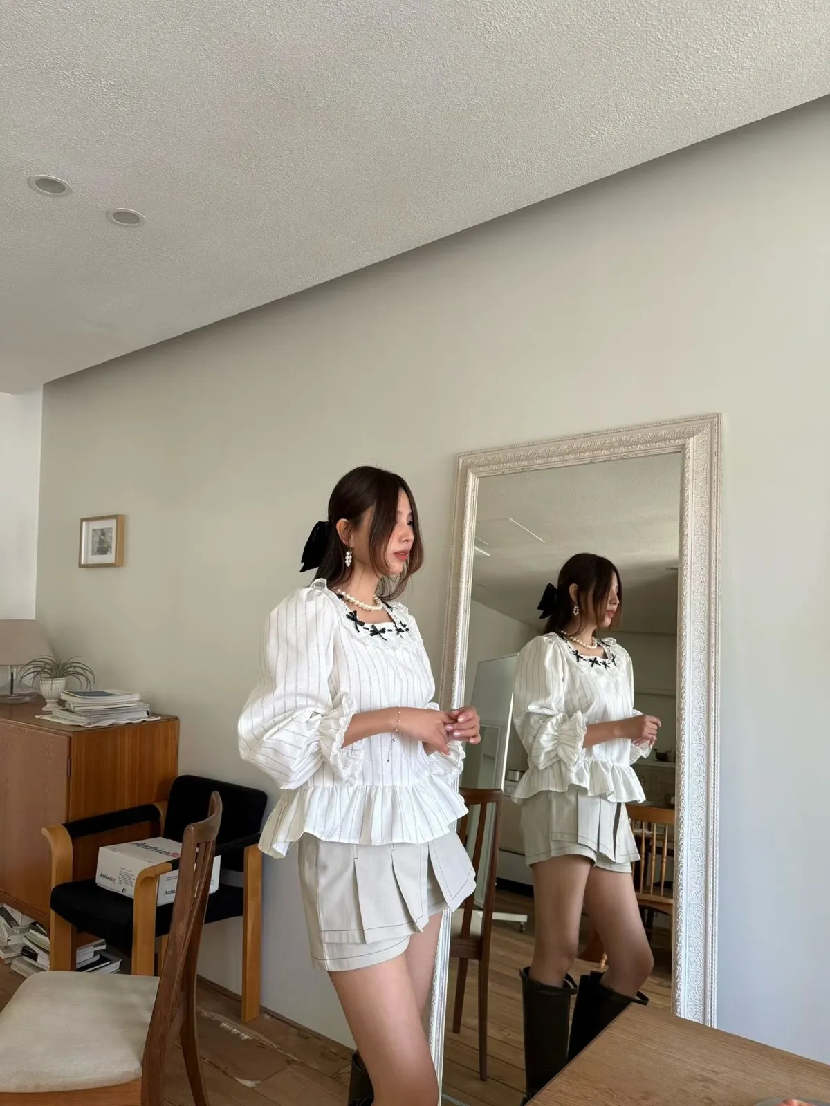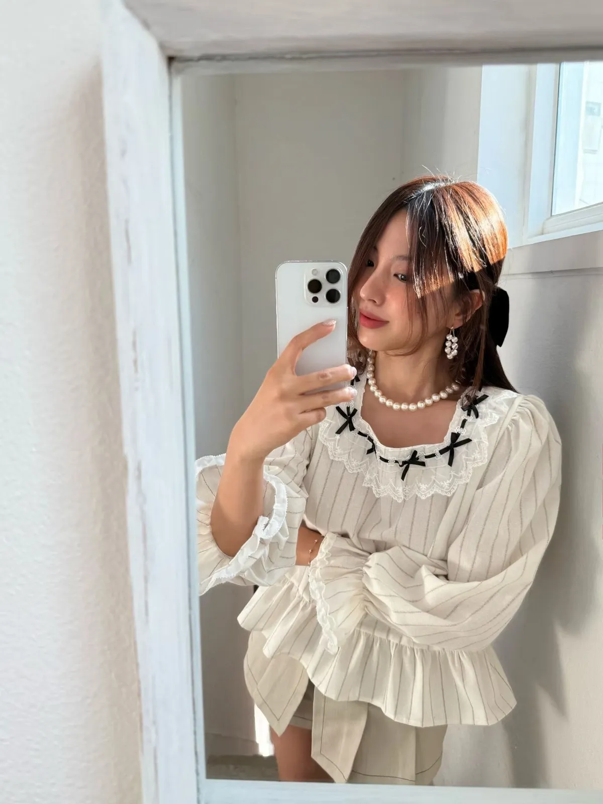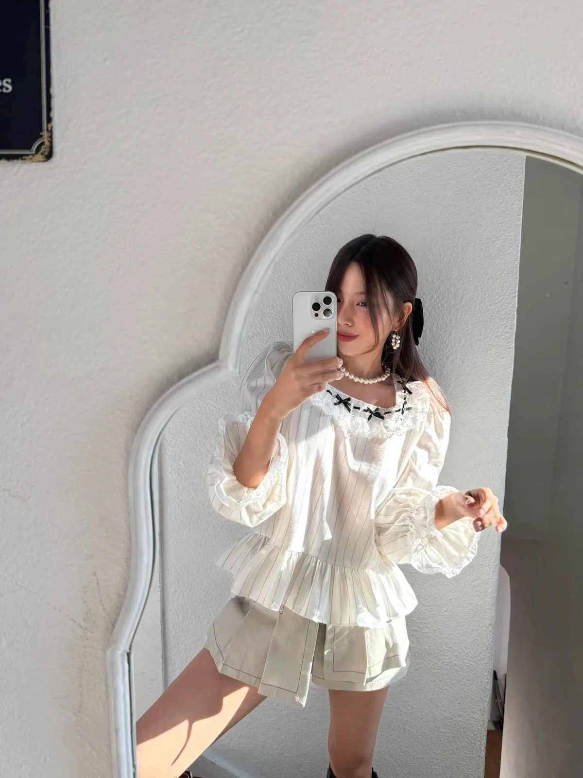 B157素希歐膩方領蝴蝶結拼接蕾絲上衣