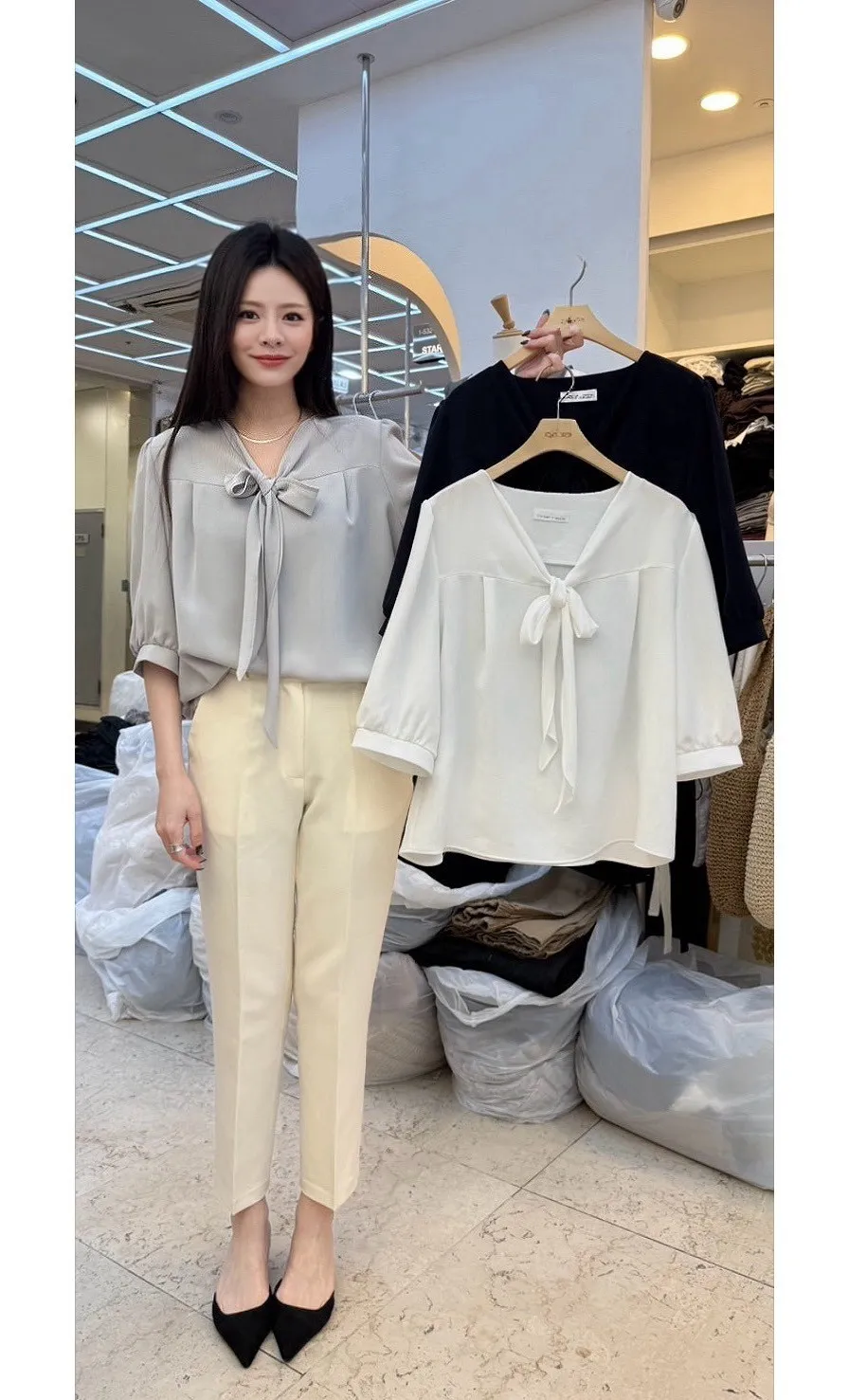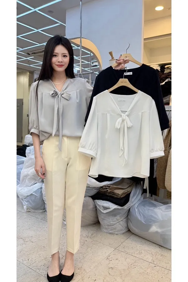 A23 0329小資家V領綁帶雪紡上衣3色