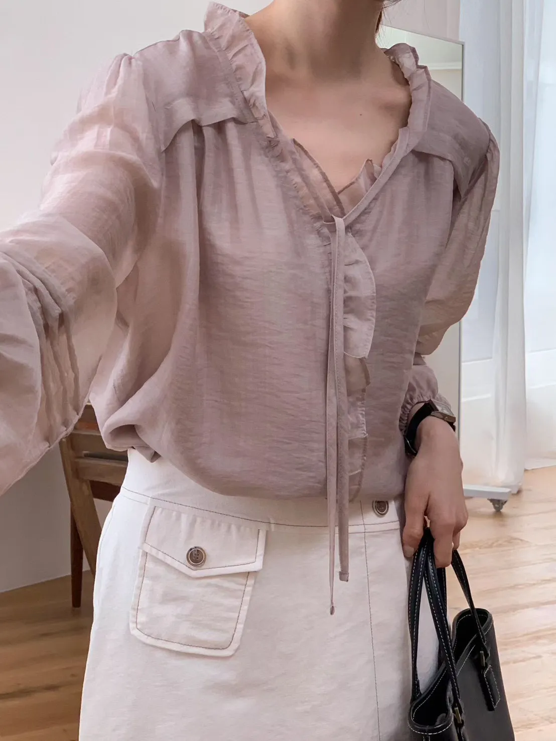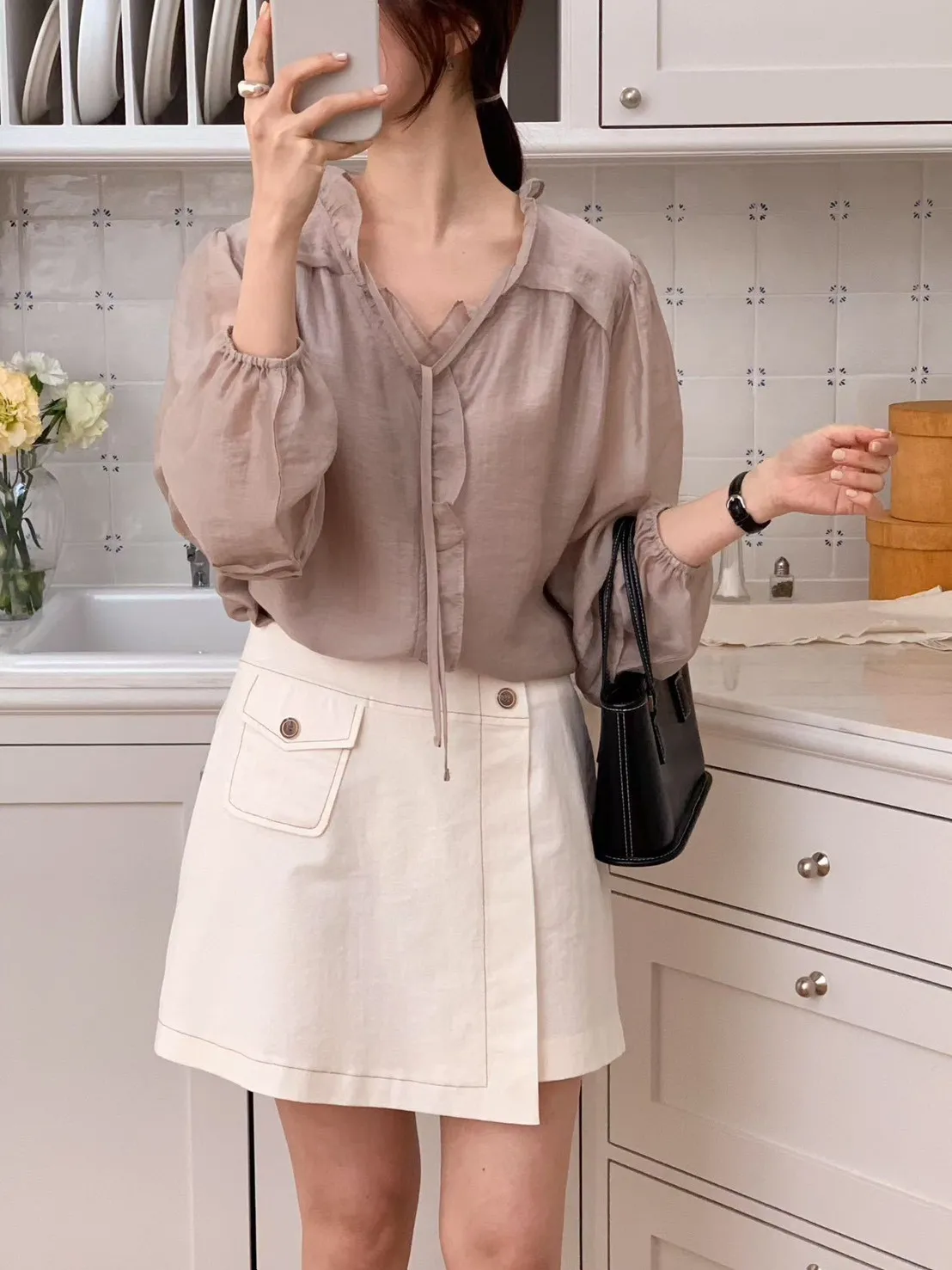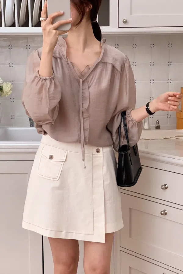 A9 0329質感家V領荷葉綁帶天絲上衣3色
