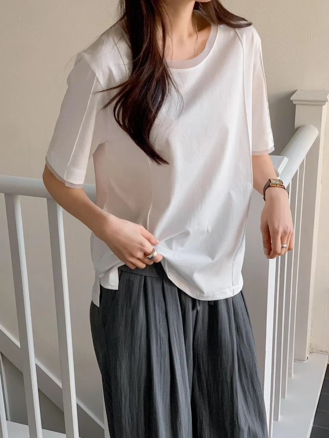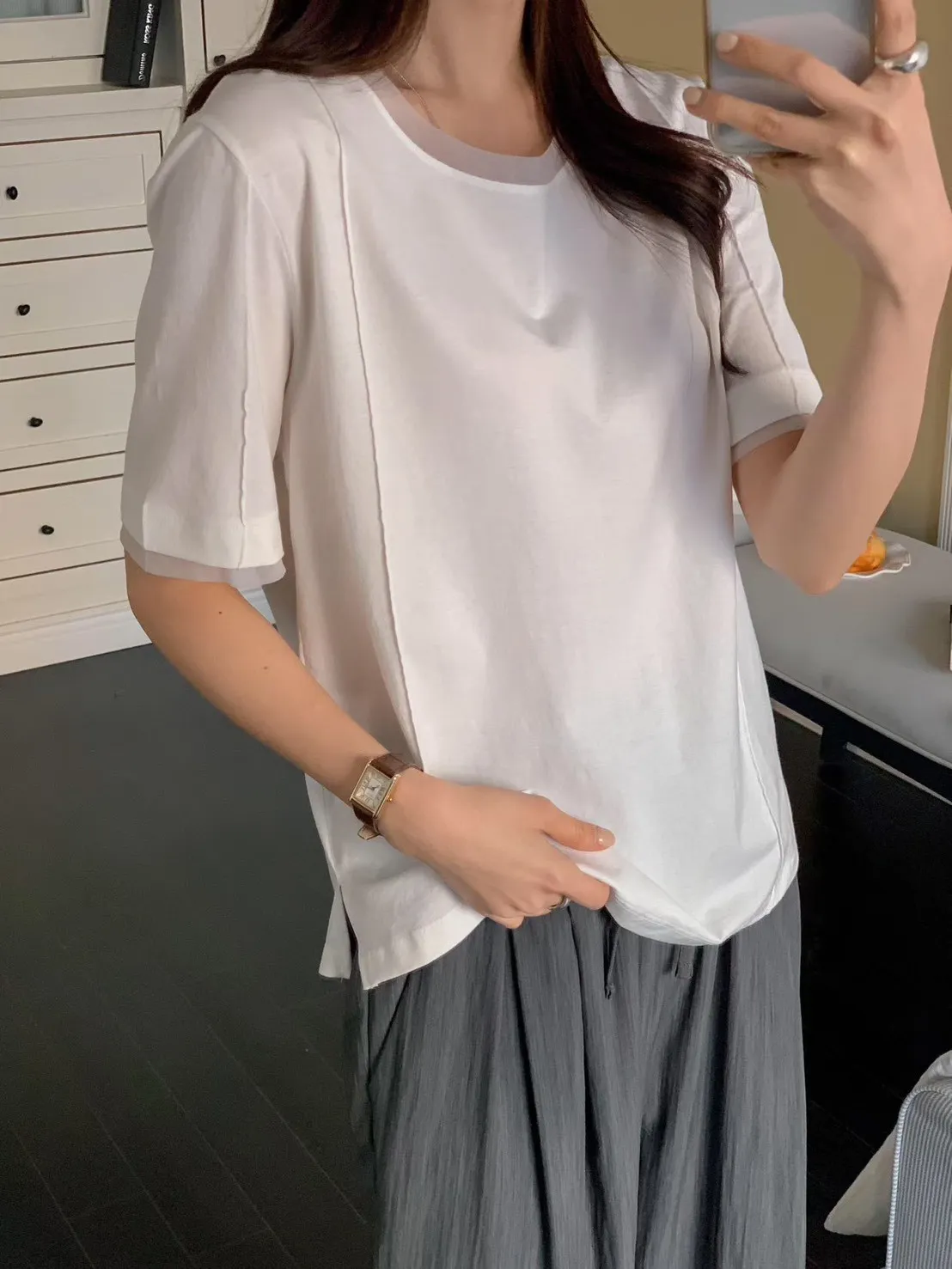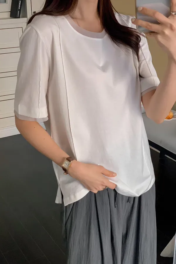 A13 0329質感家圓領涼感拼蕾絲T恤上衣4色