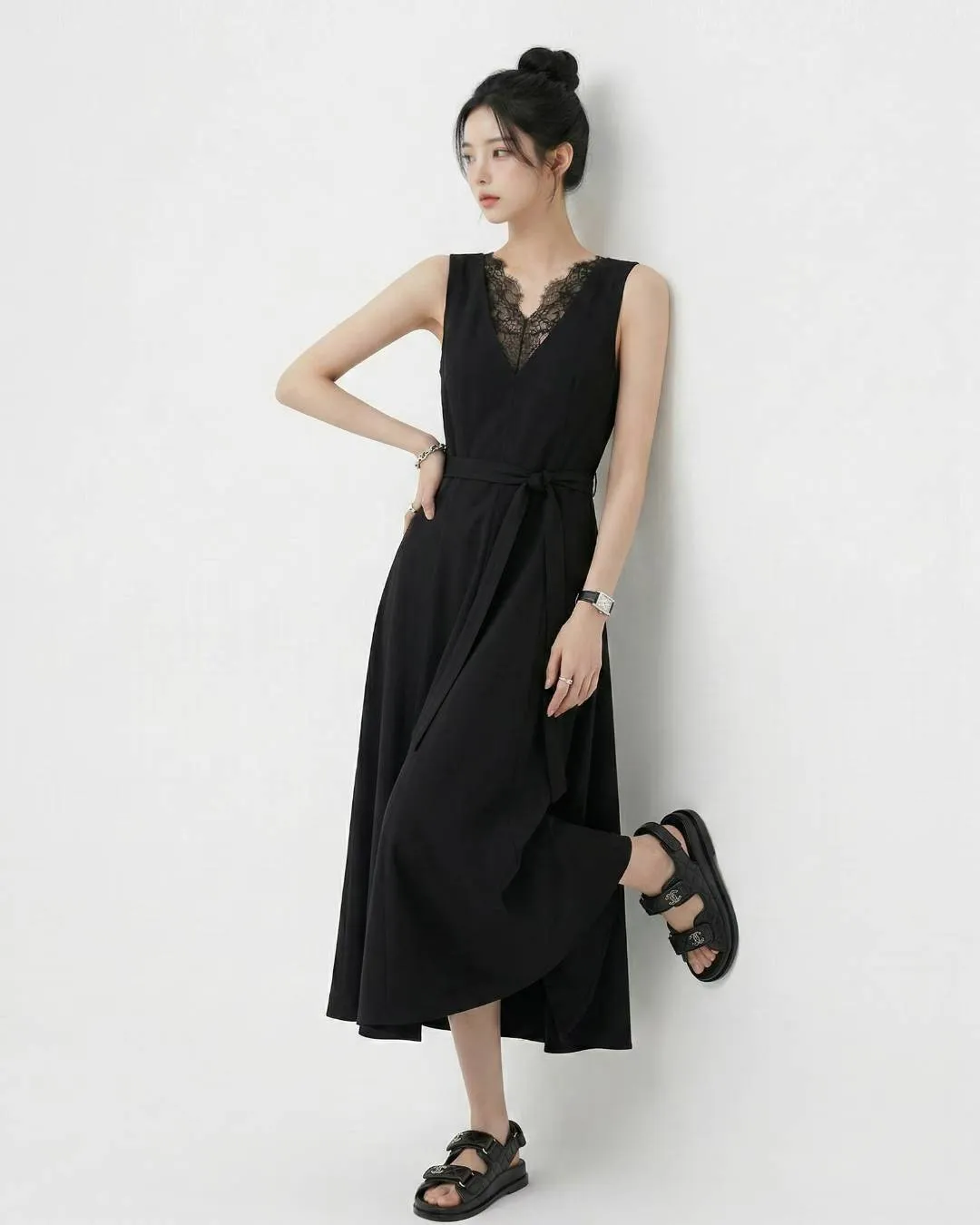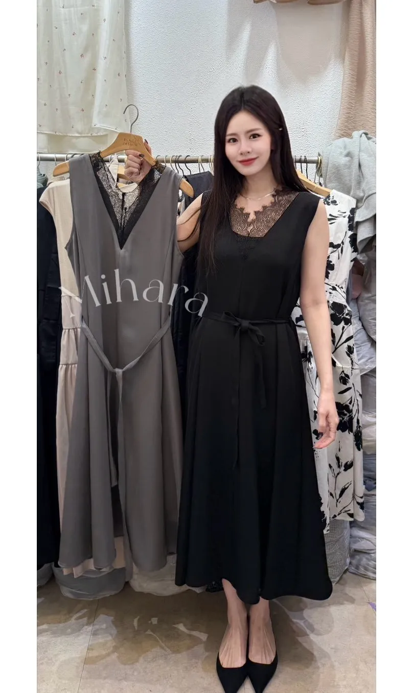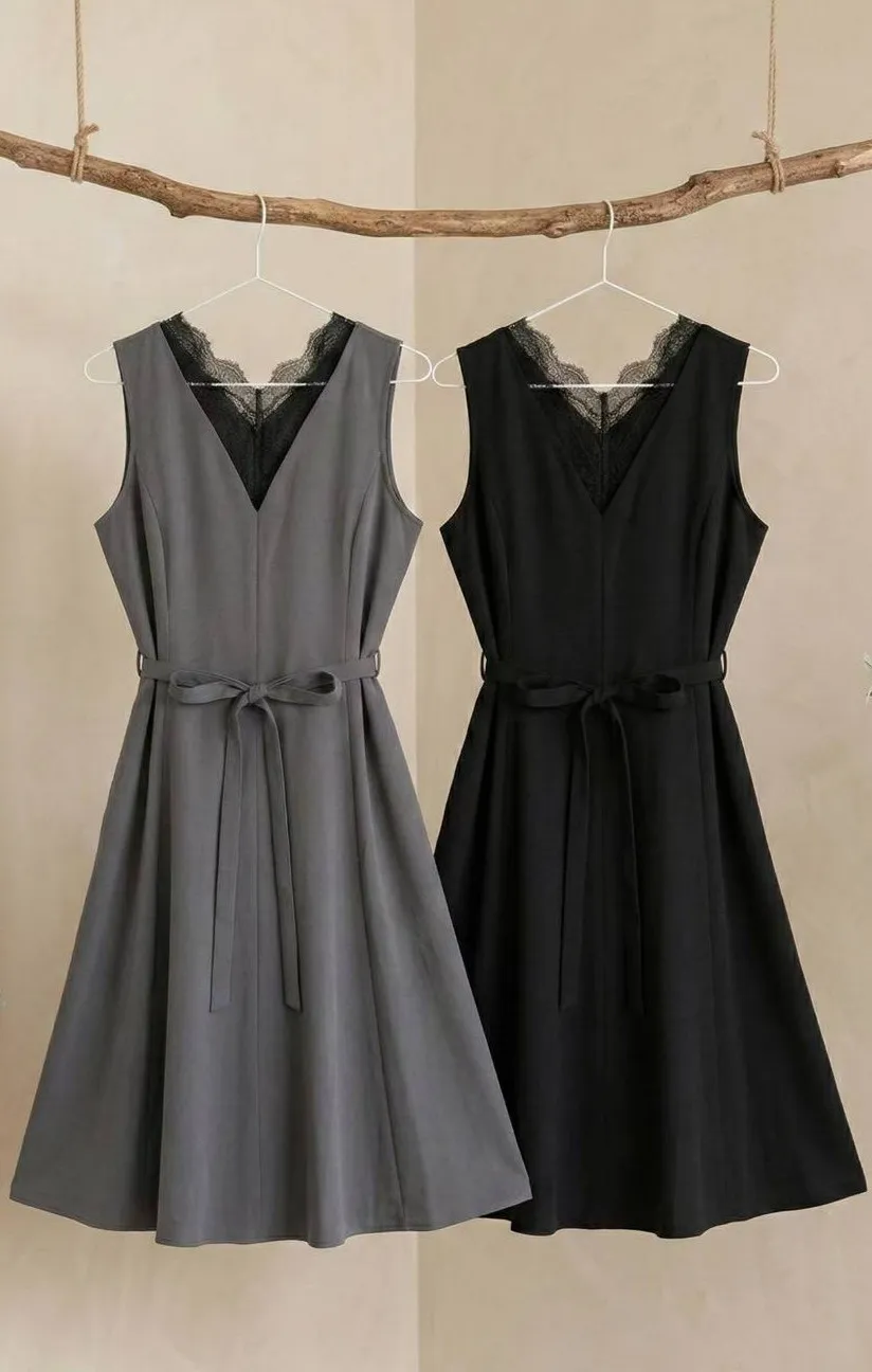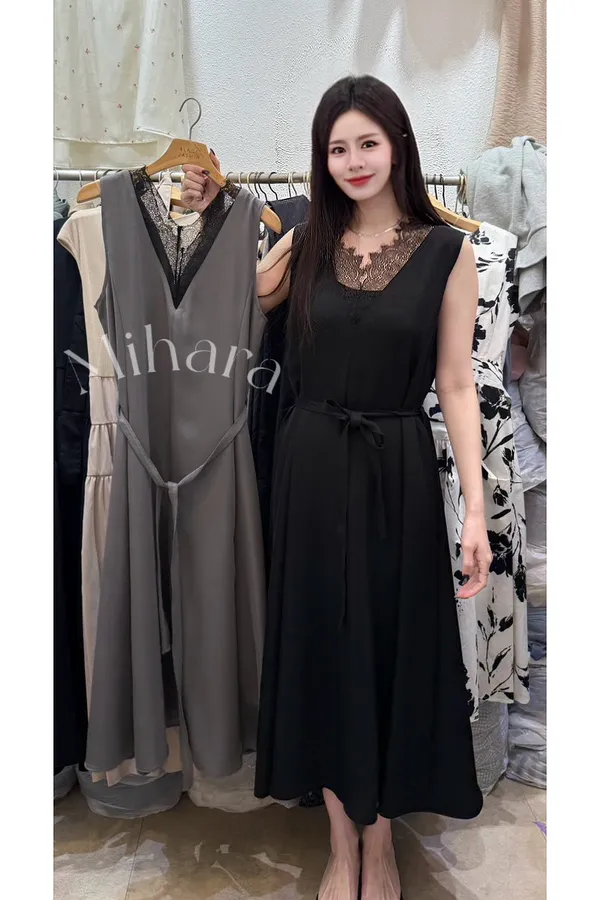 A16 0331(推)仙女前後V領蕾絲拼接腰身綁帶洋裝2色