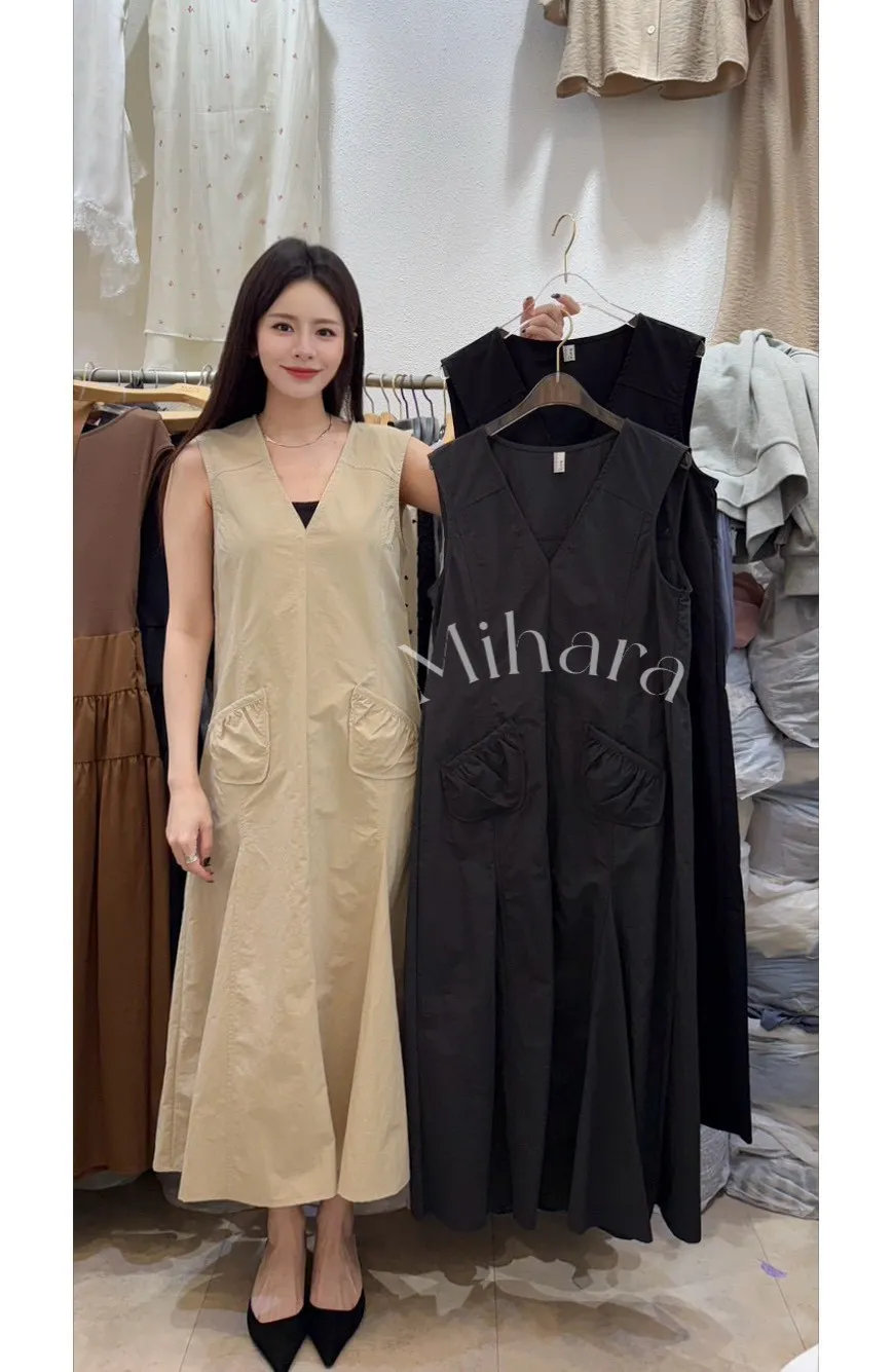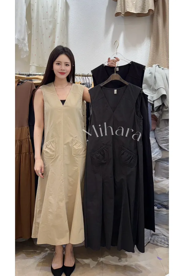 A19 0331休閒V領腰身口袋洋裝3色