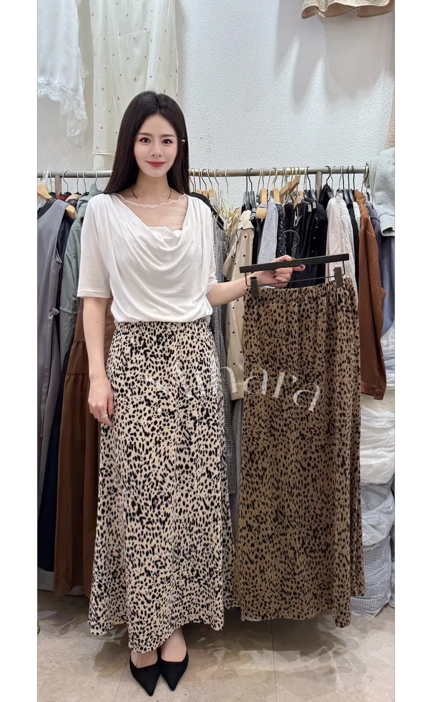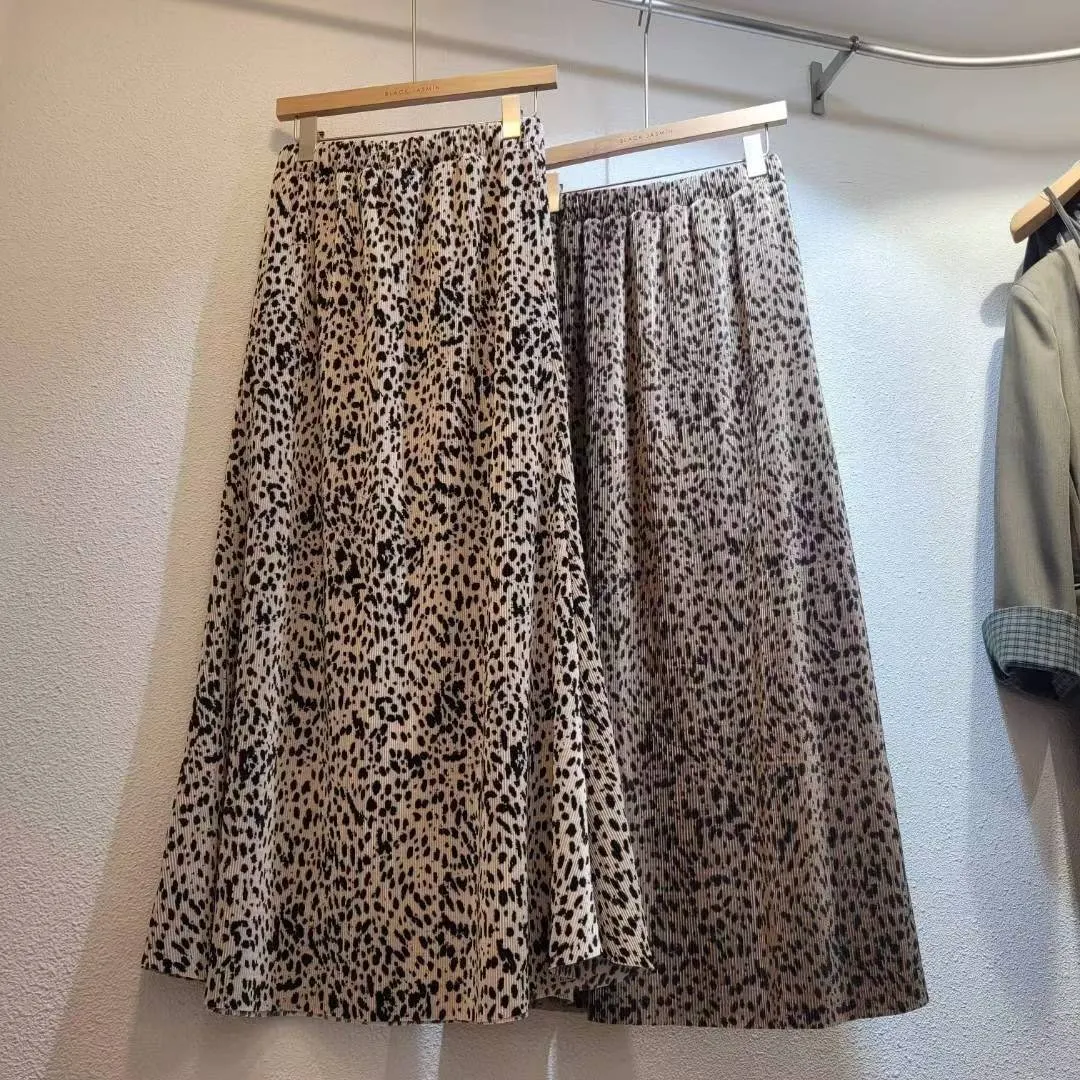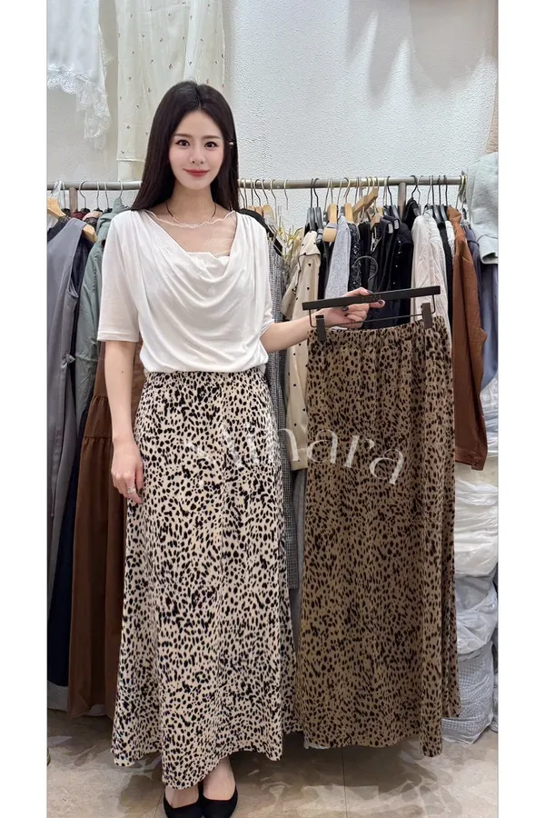 A25 0331舒適彈性腰圍壓褶豹紋小魚尾裙2色
