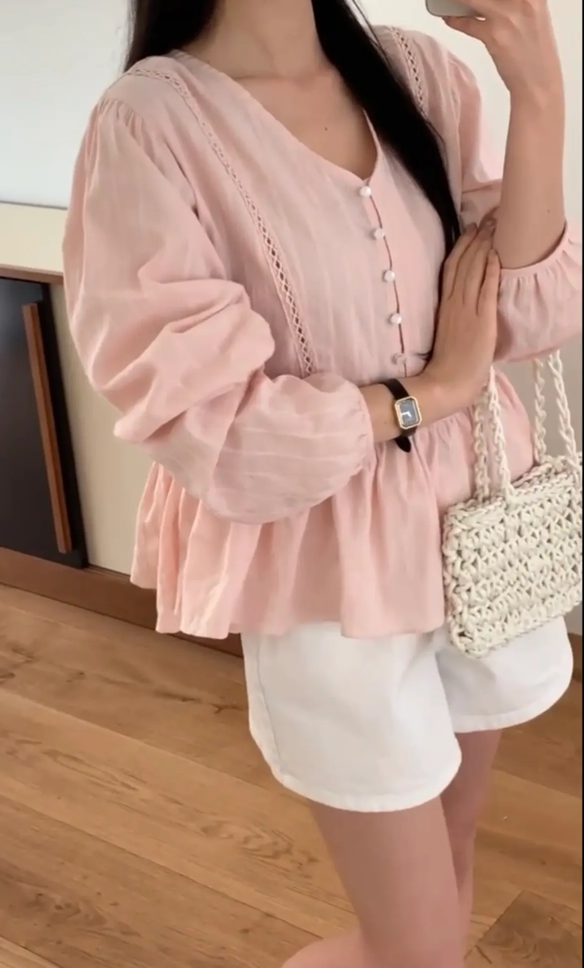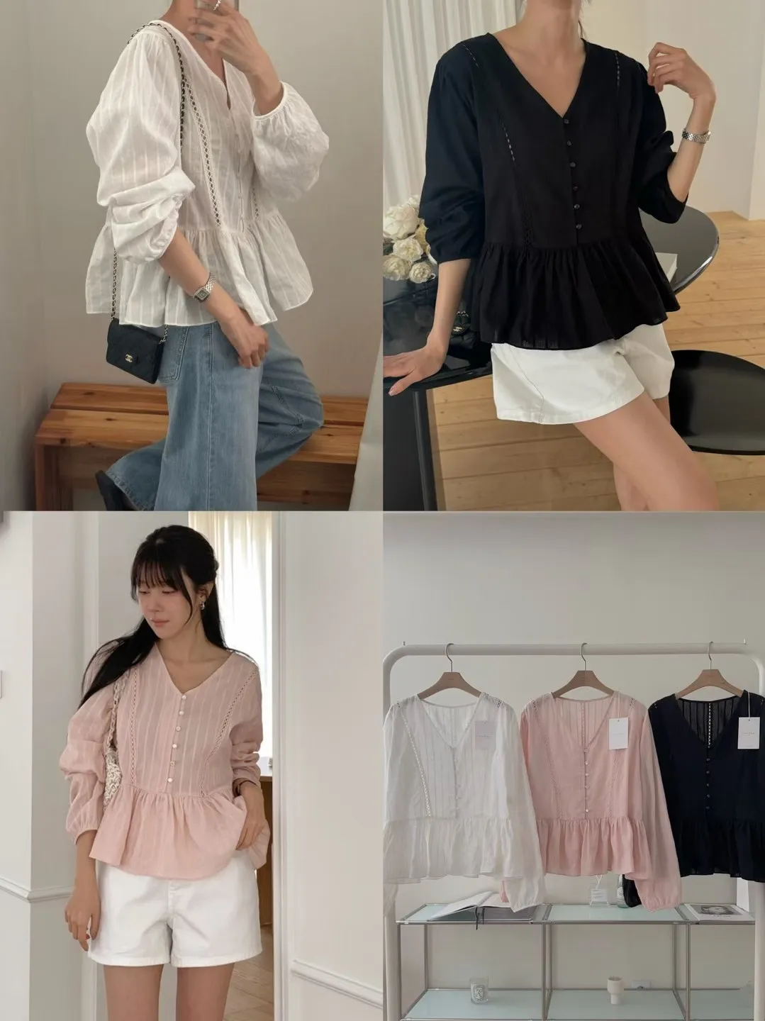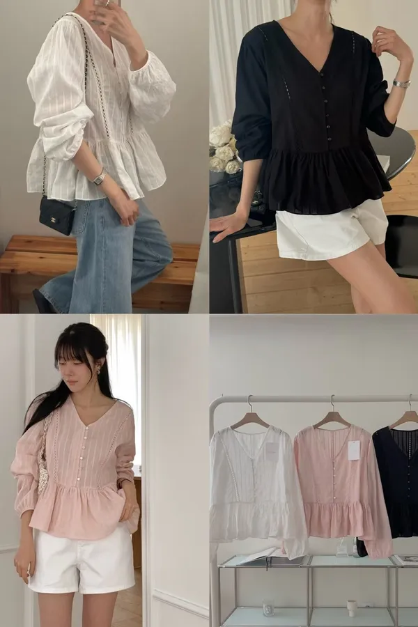 B80拱門家V領側邊蕾絲點綴直紋上衣3色