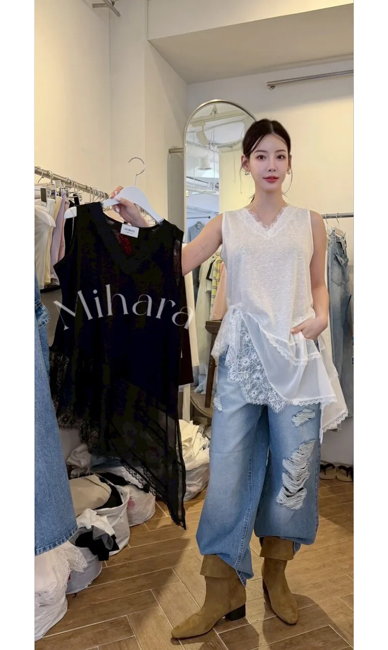 A12 0405舒淇歐膩家拼接雪紡蕾絲側不規則下擺側開衩V領背心2色