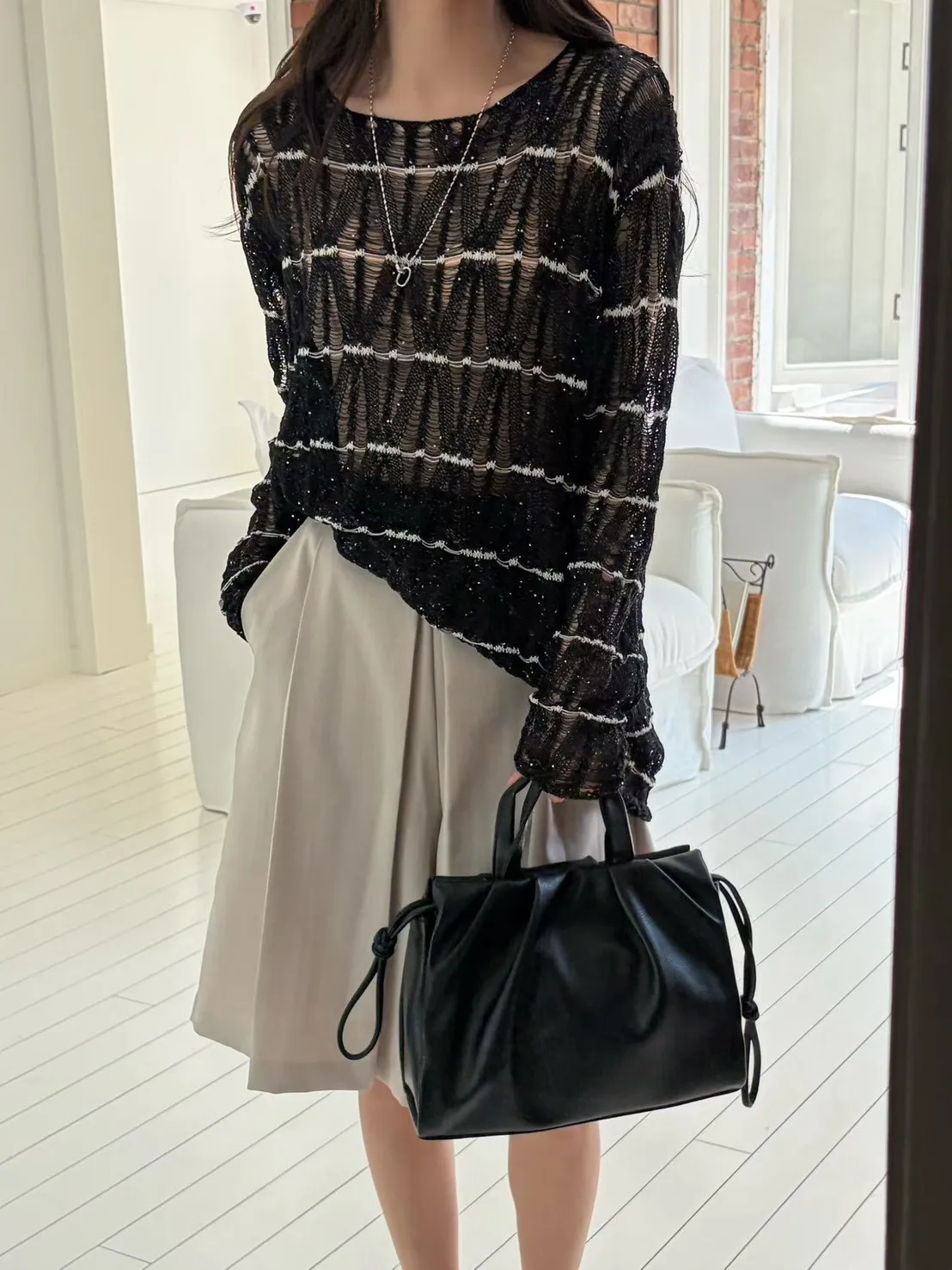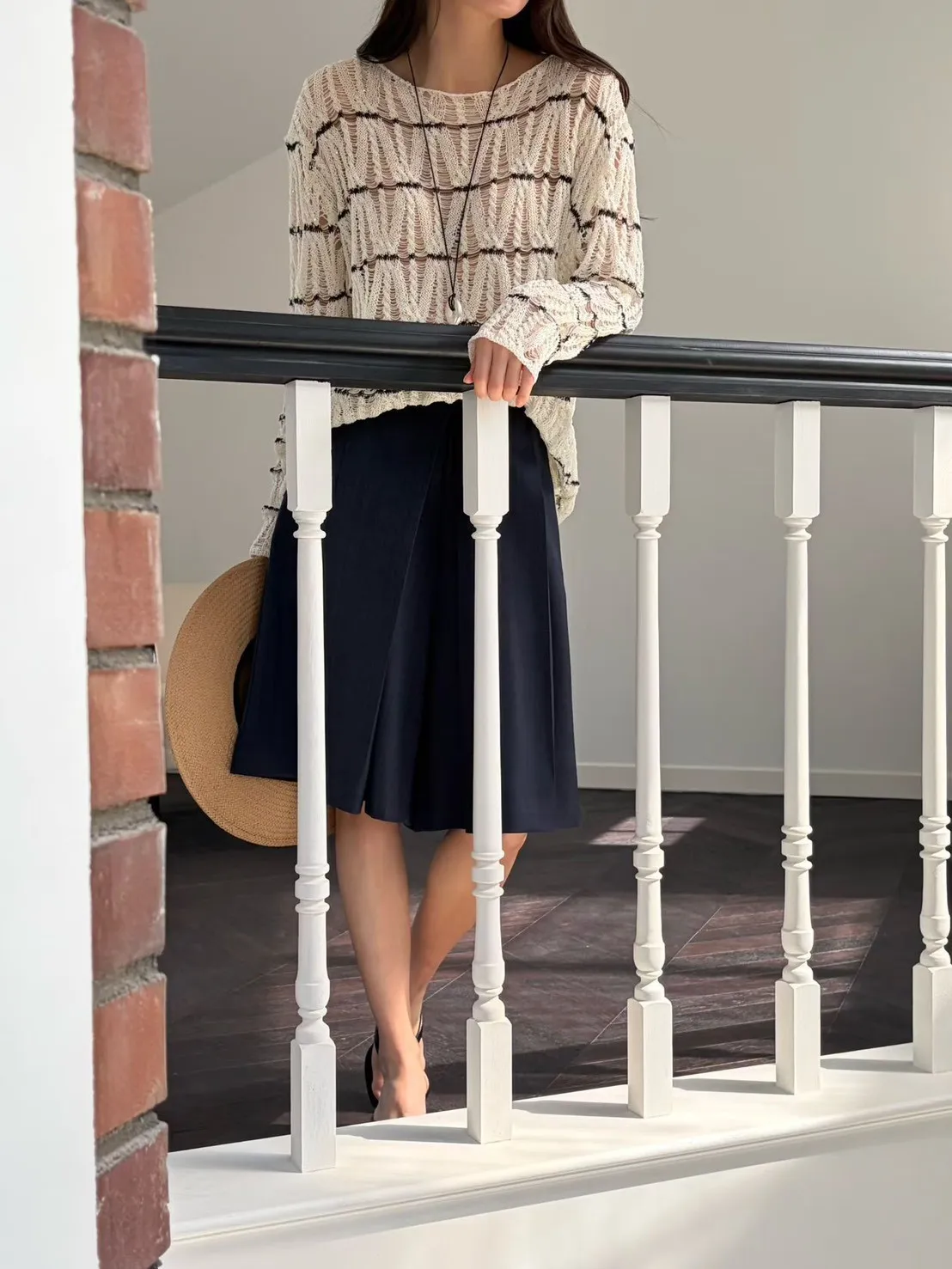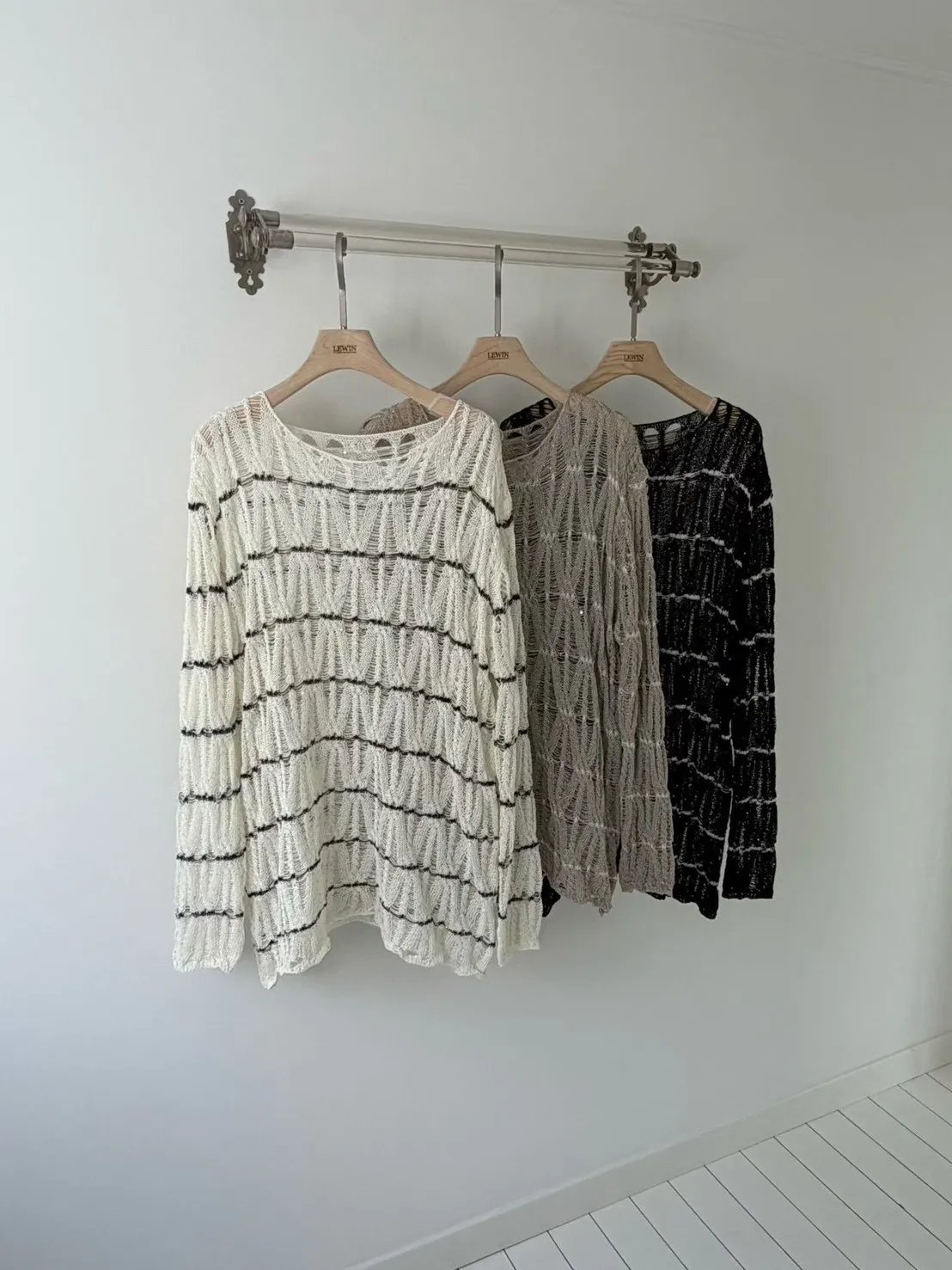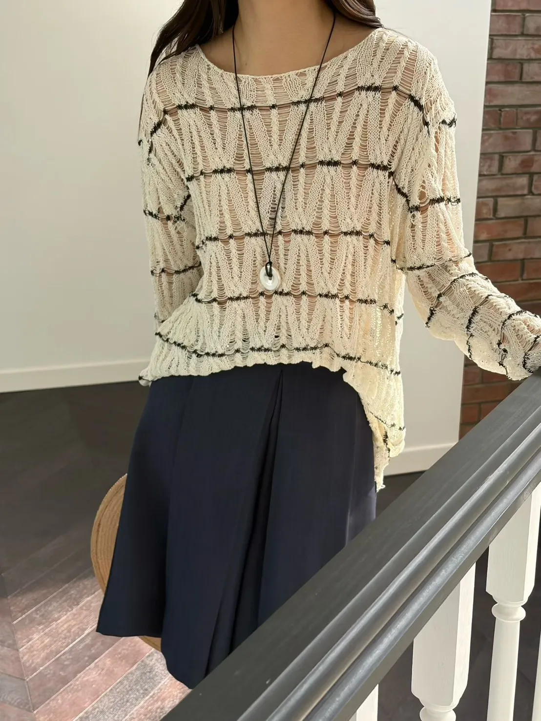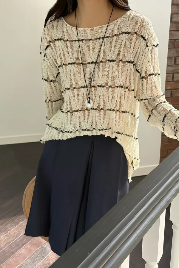 A41 0407名媛歐膩家橫條圓領洞洞上衣3色