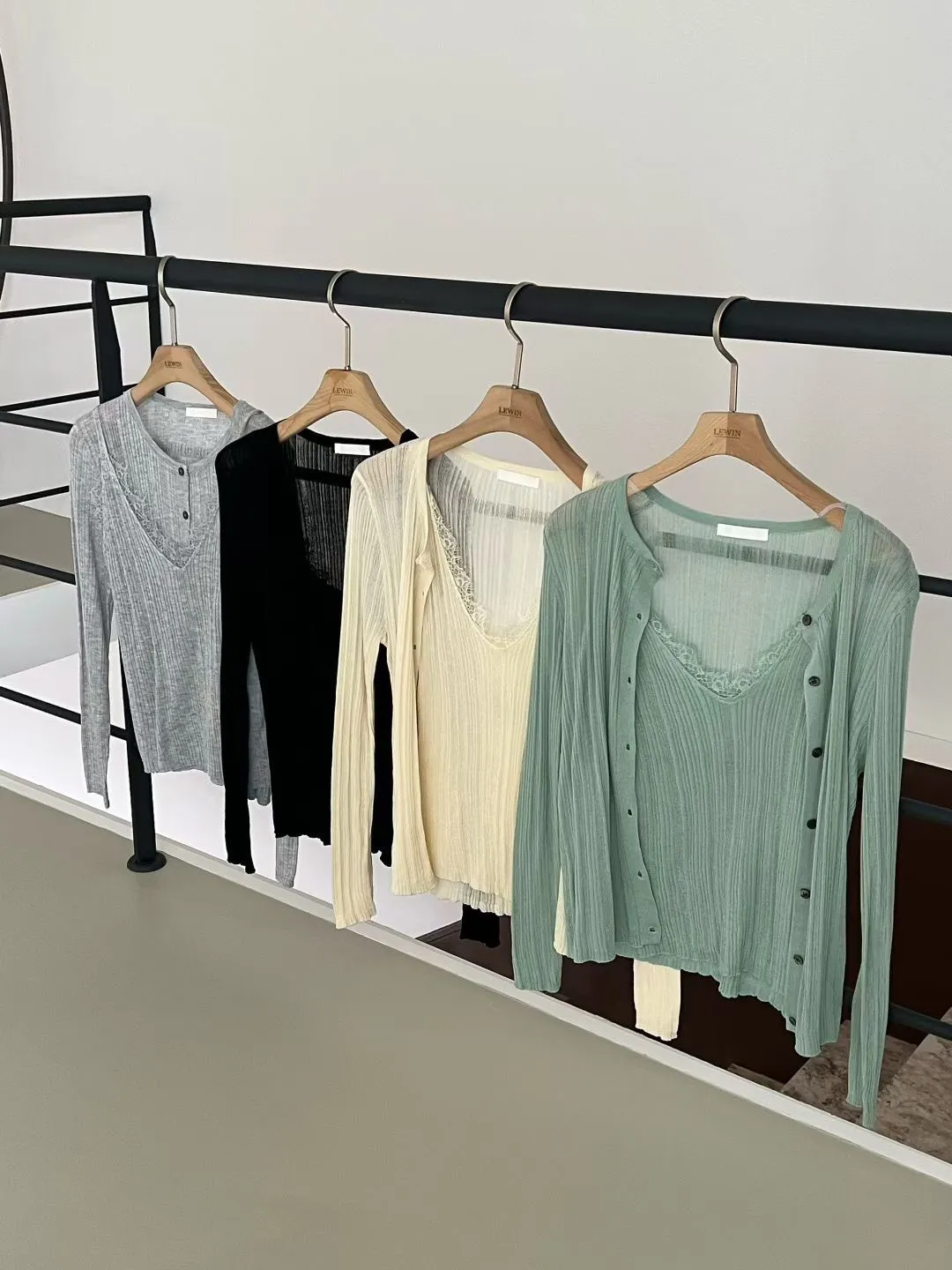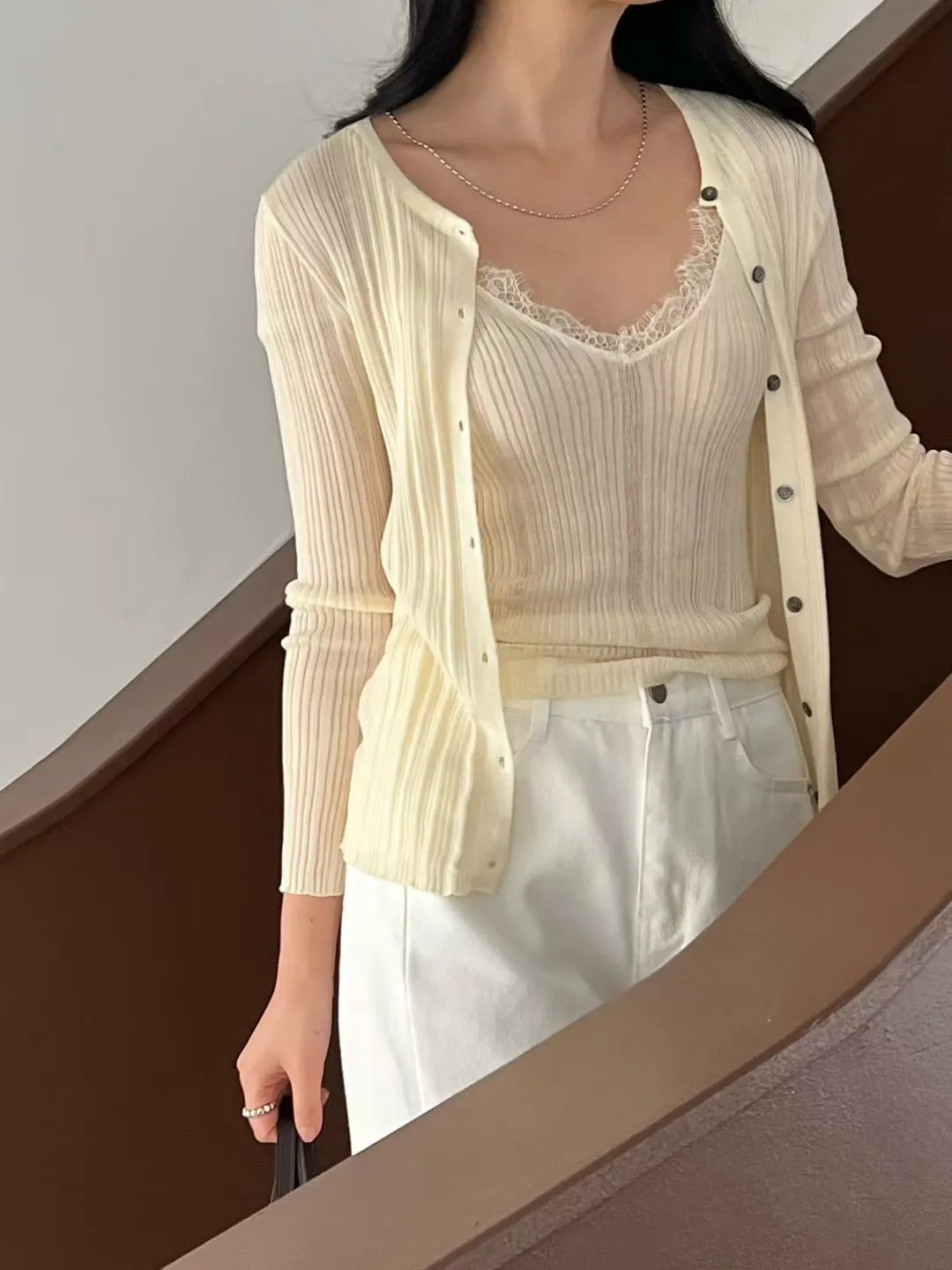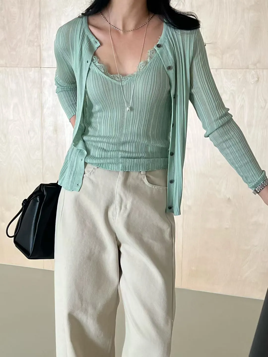 A46 0407名媛歐膩家V領罩衫+拼接睫毛蕾絲細肩帶背心(SET)4色