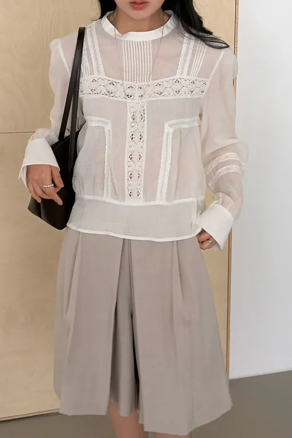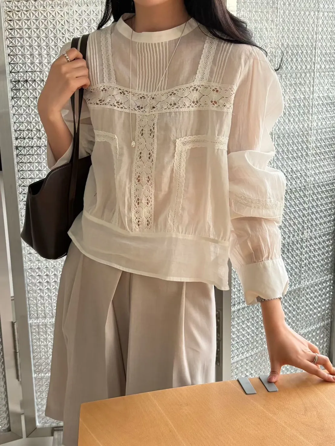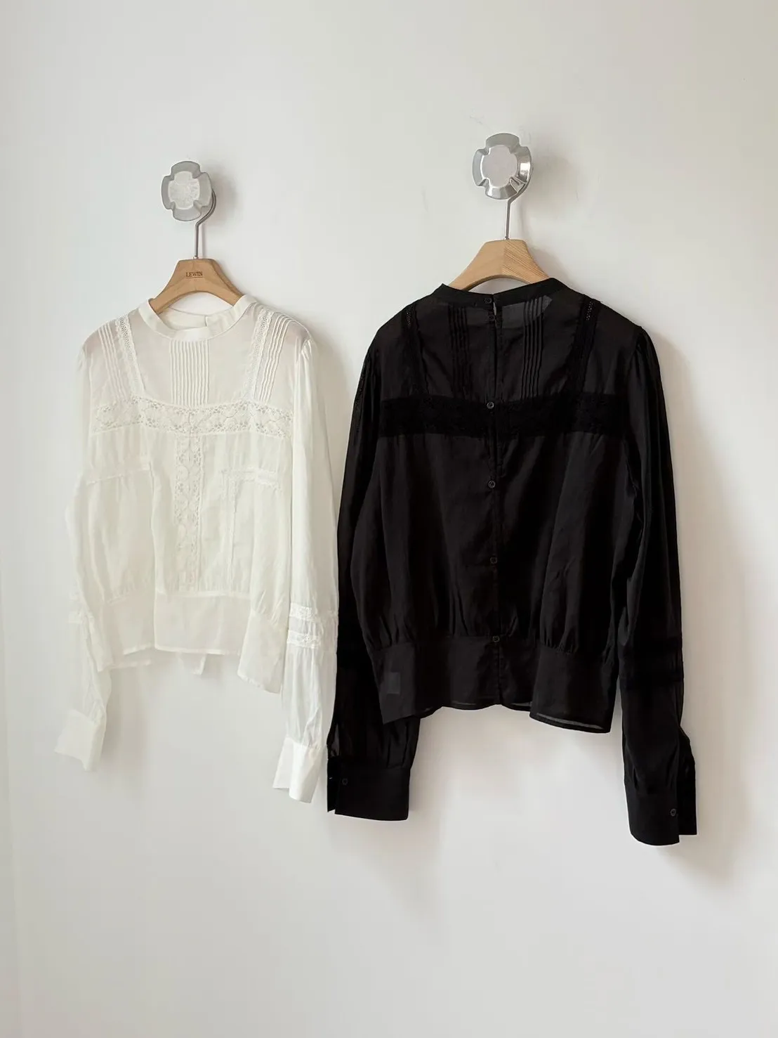 A52 0407名媛歐膩家拼接燒花蕾絲兩面穿圓領上衣2色