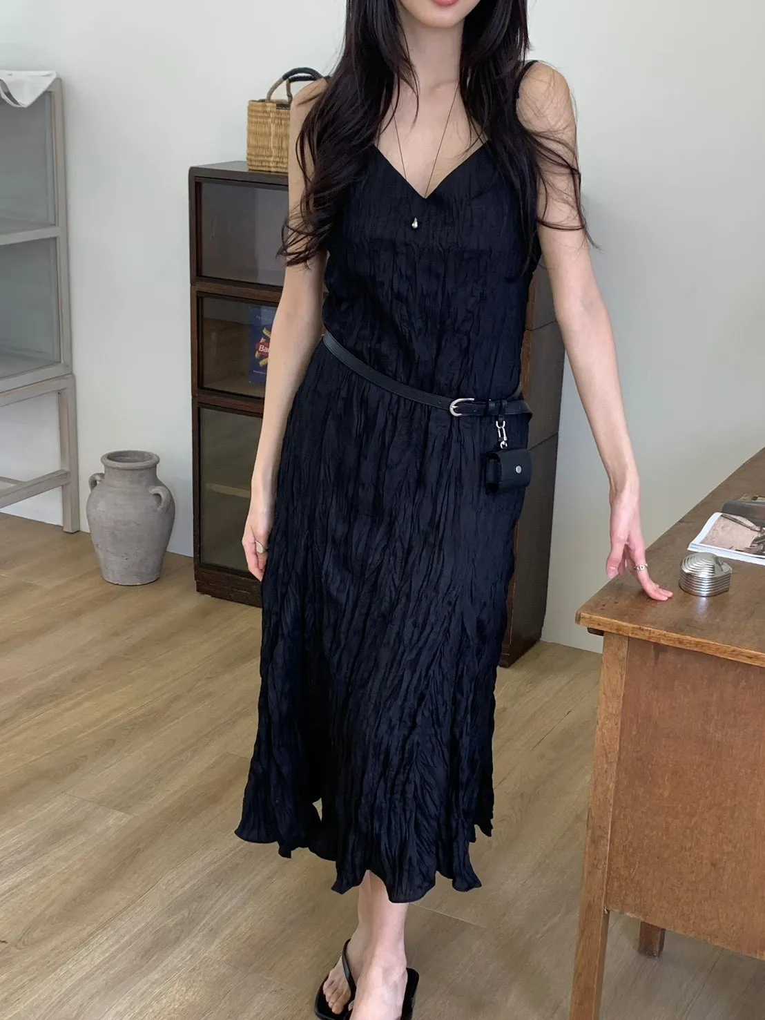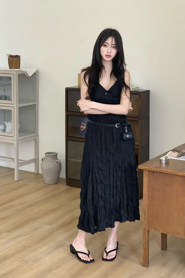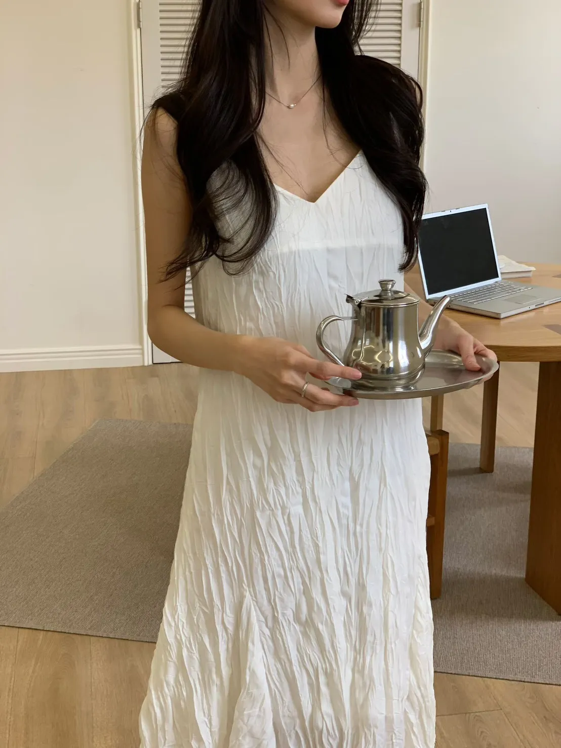 A68 0407漂亮姊姊家細肩帶V領皺皺背心洋裝2色