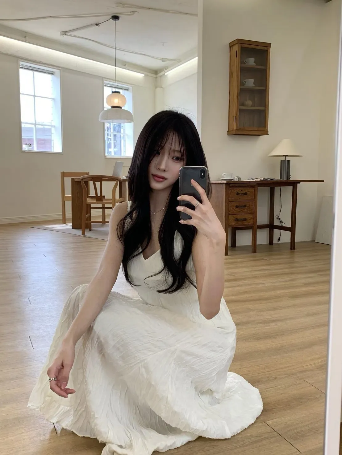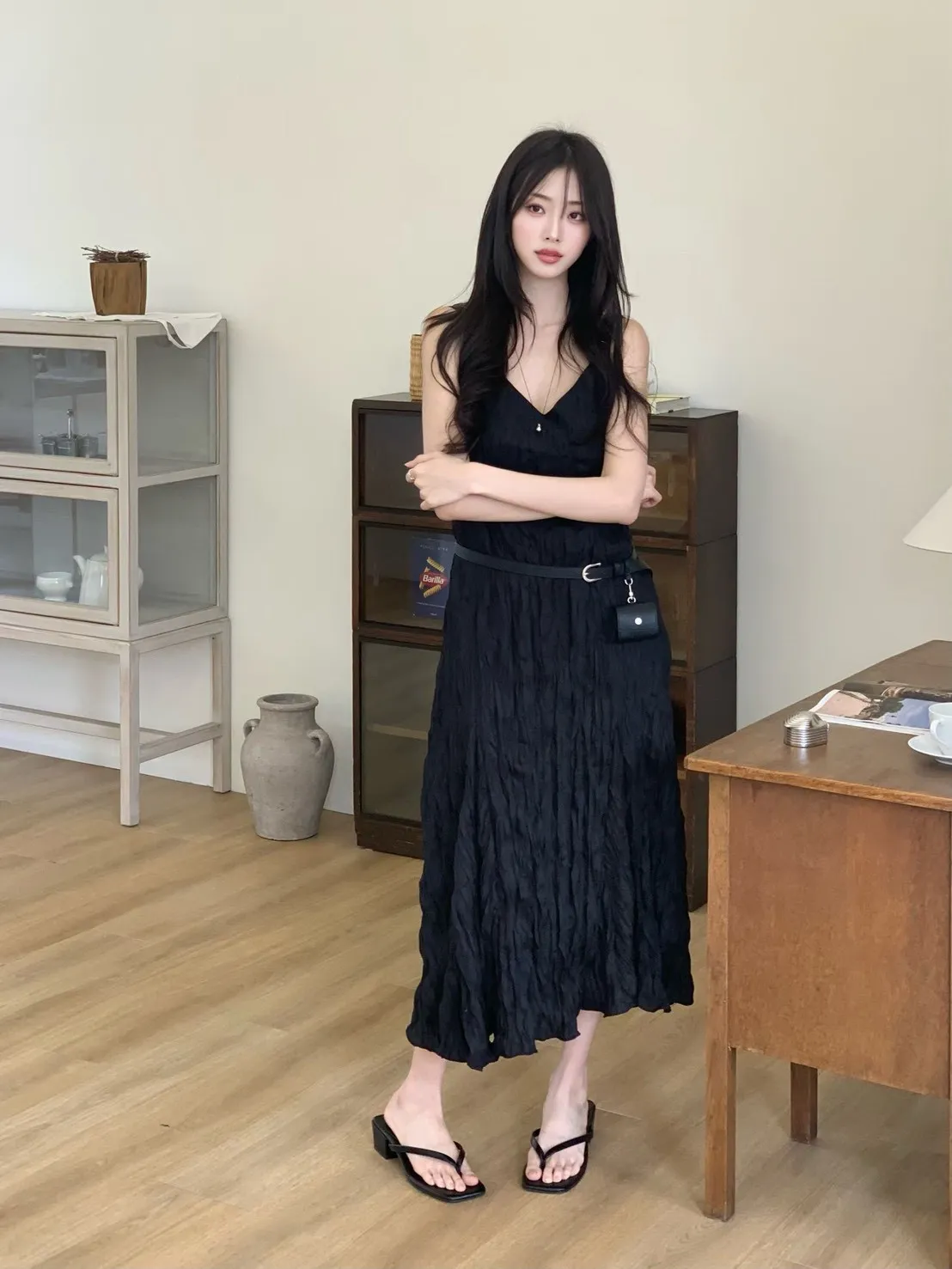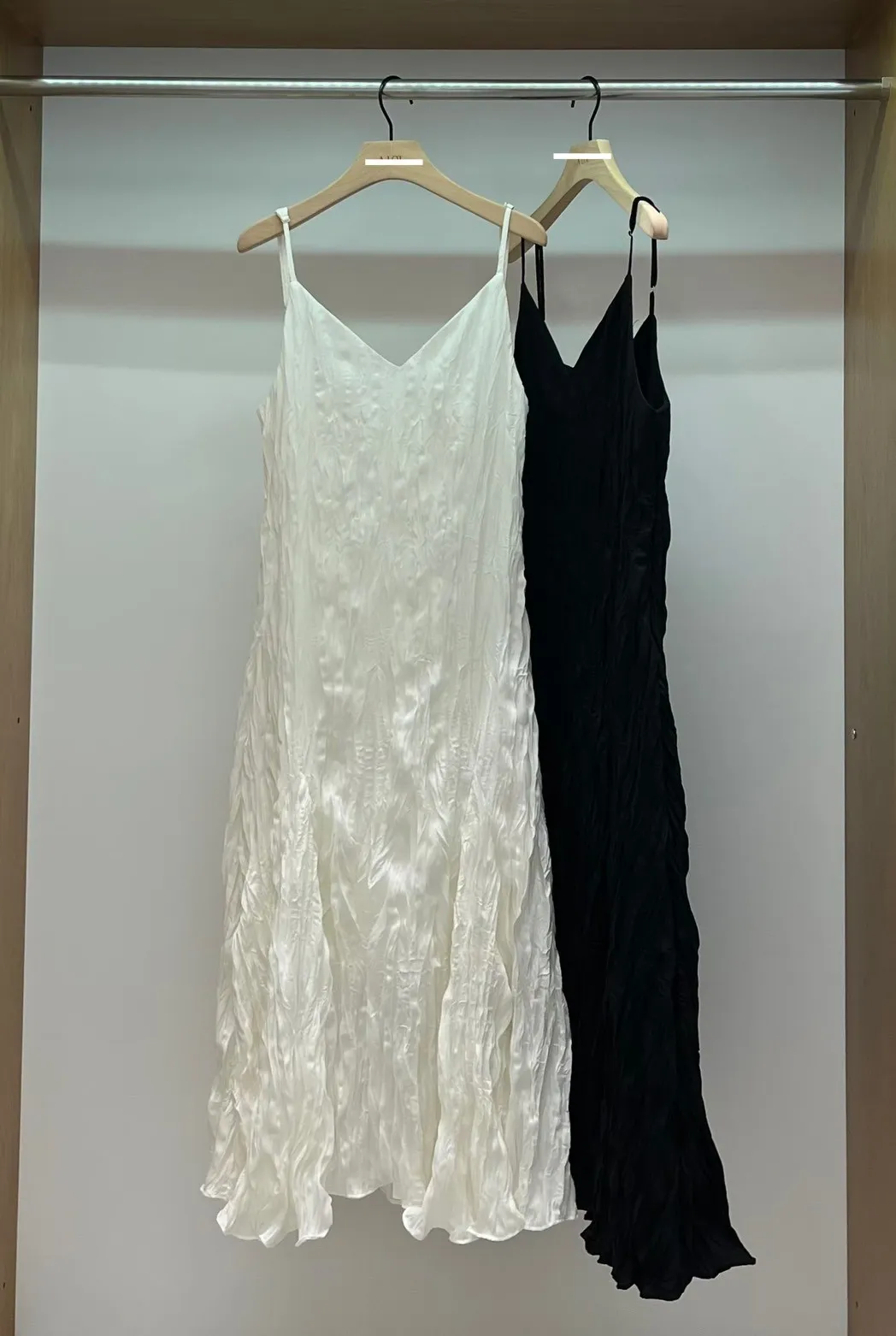 A68 0407漂亮姊姊家細肩帶V領皺皺背心洋裝2色