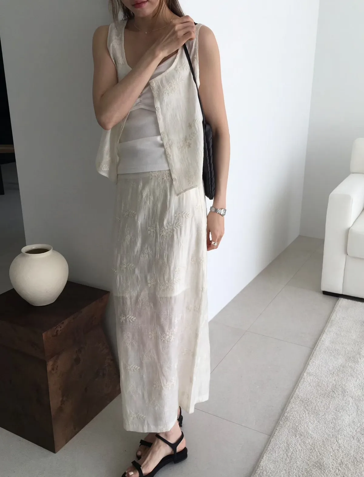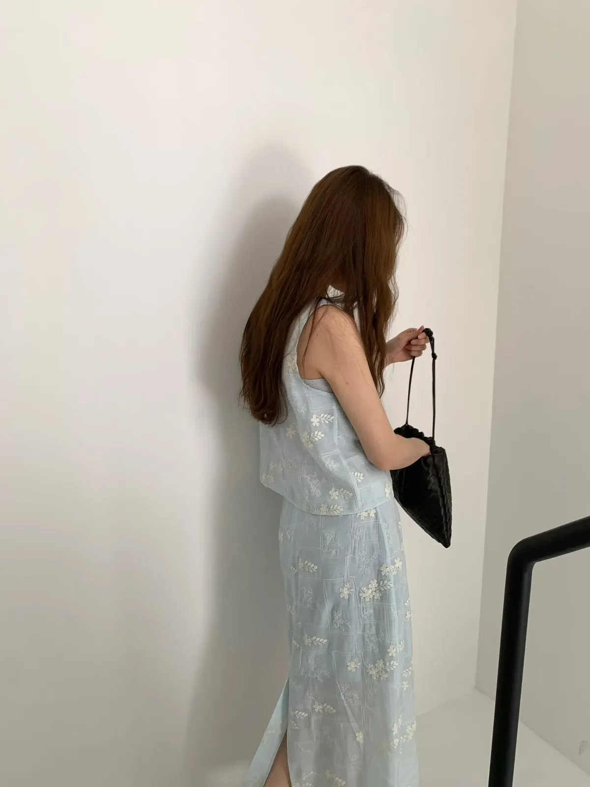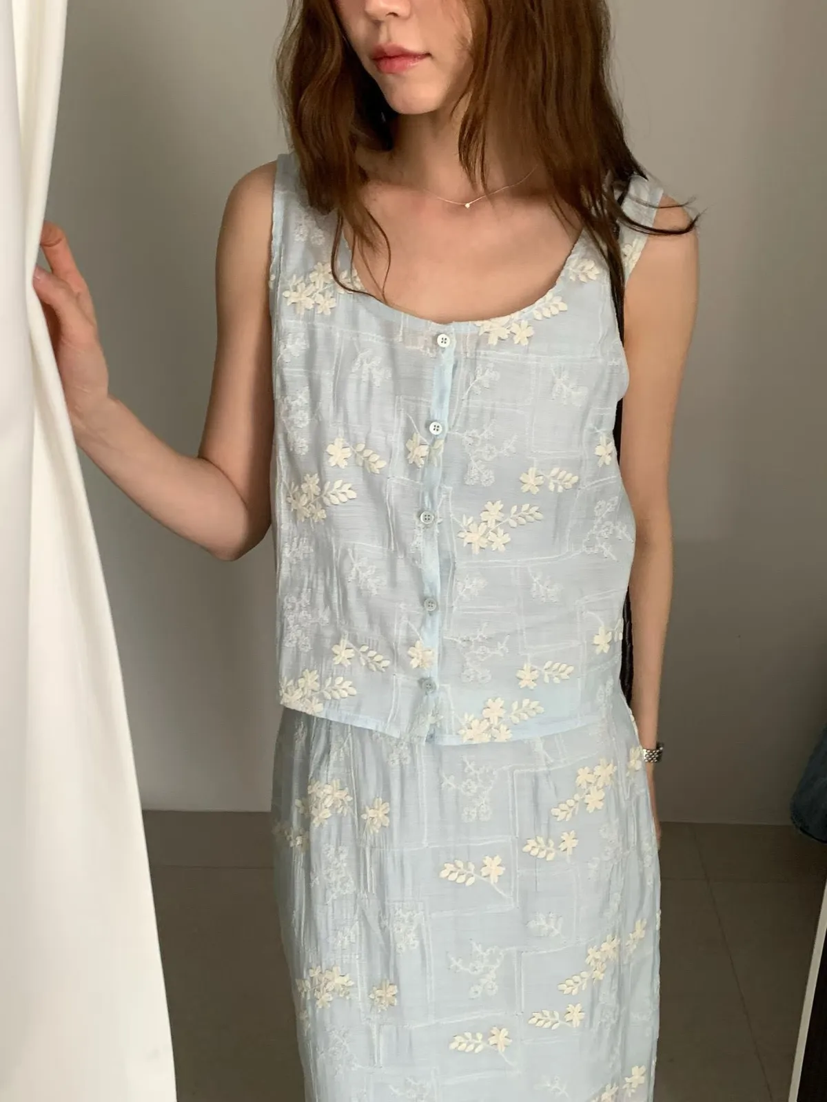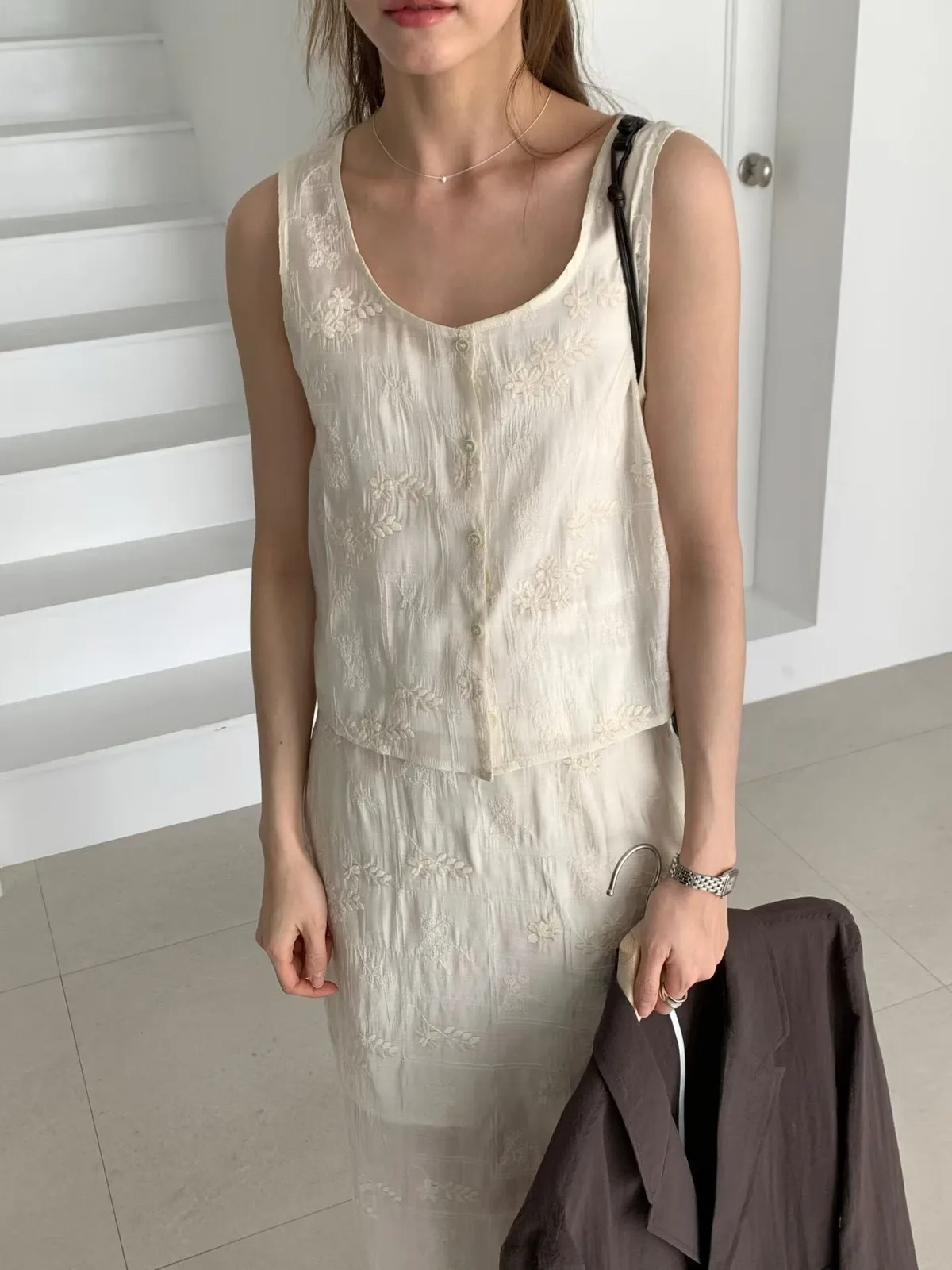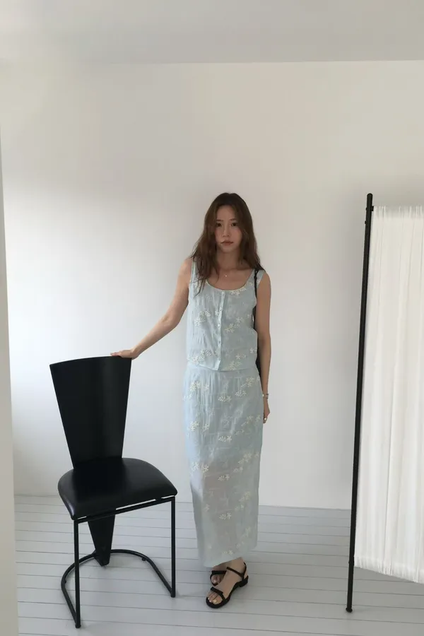 B262捲髮歐膩開釦背心+彈性腰後開叉裙子(set)
