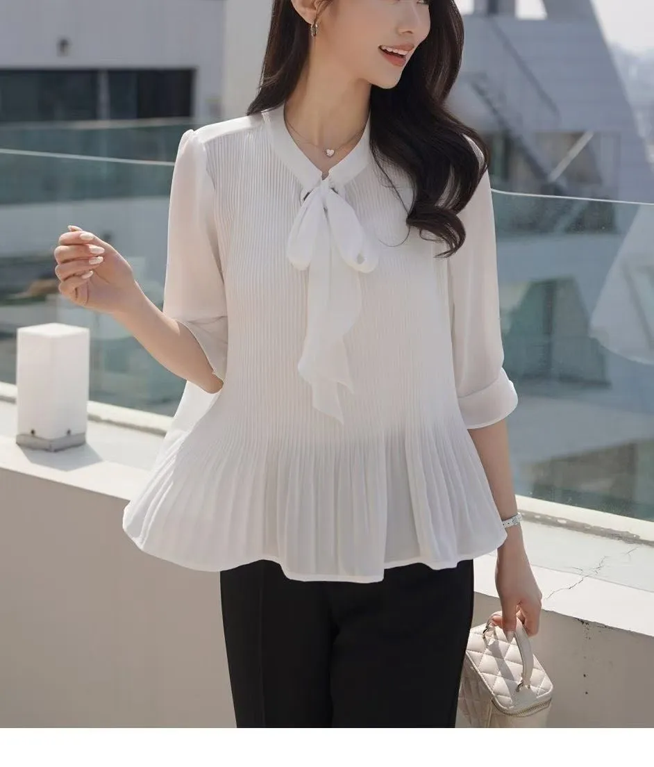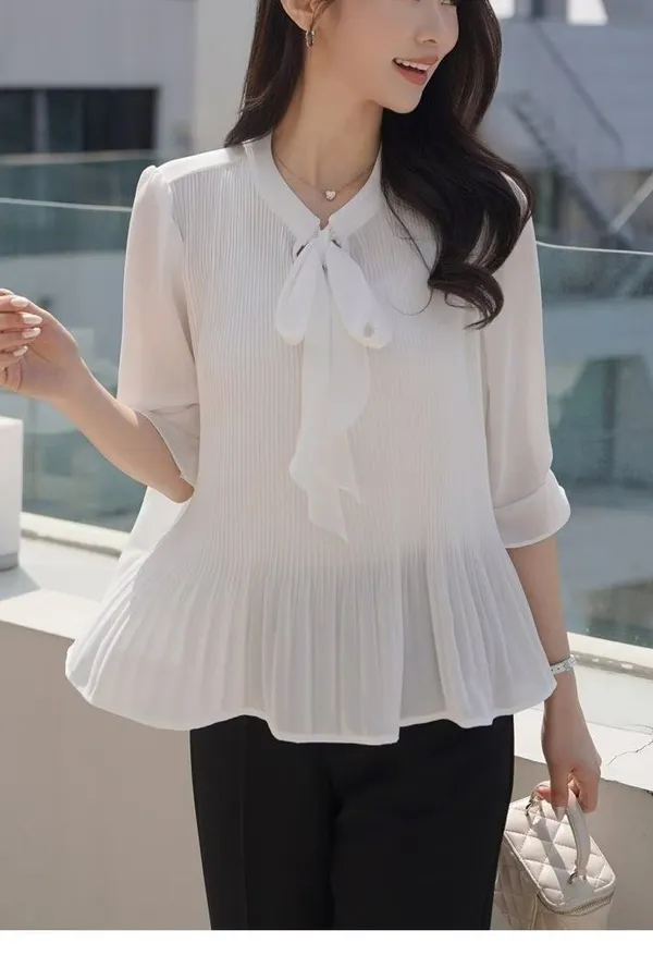 B225綁帶細摺雪紡上衣3色