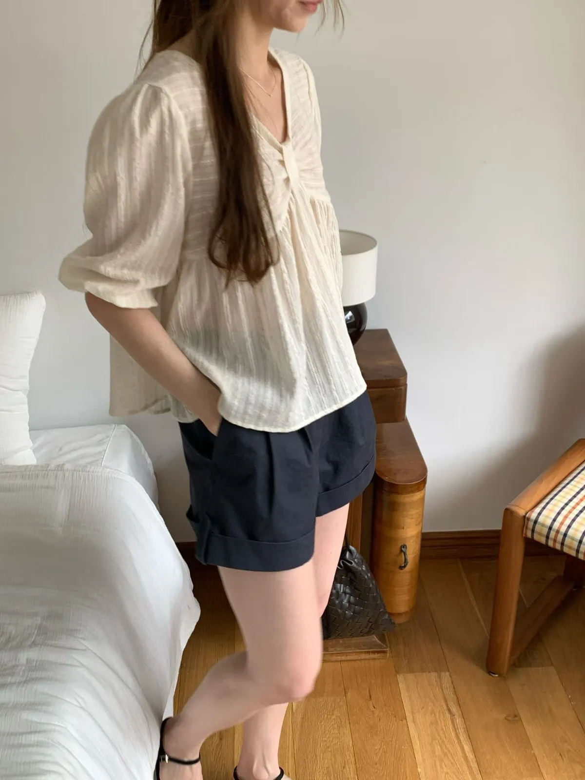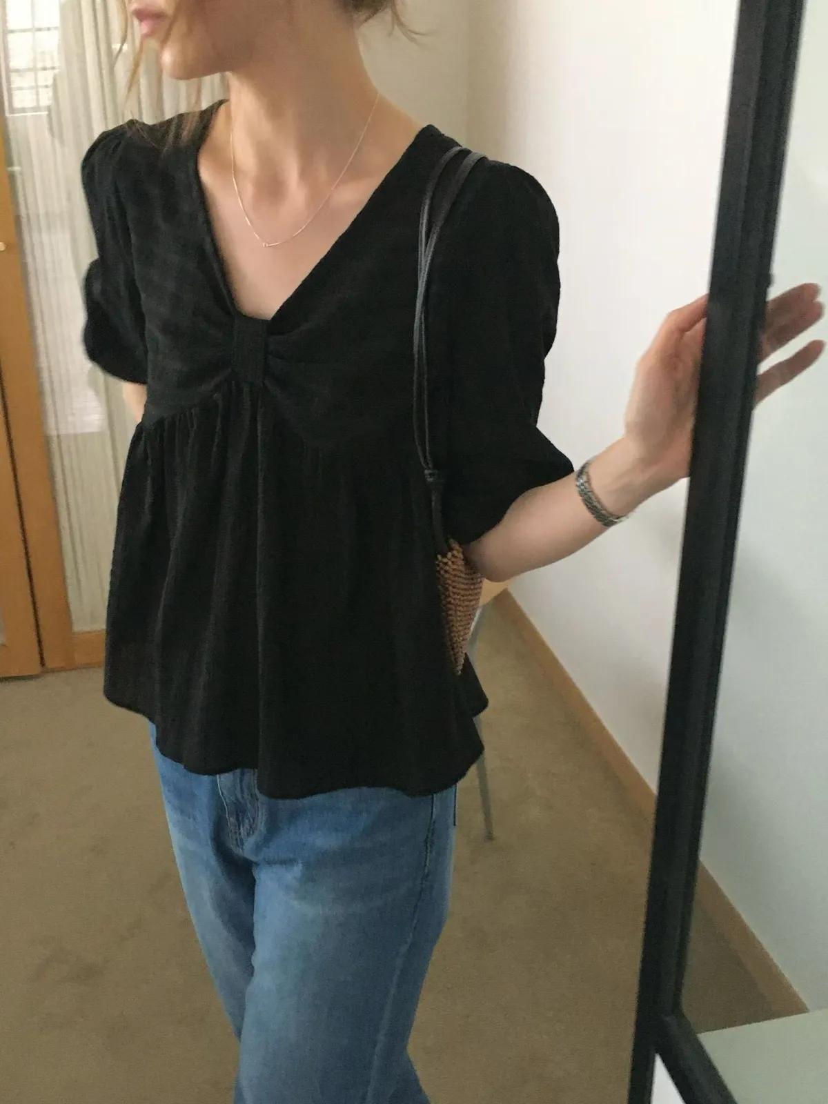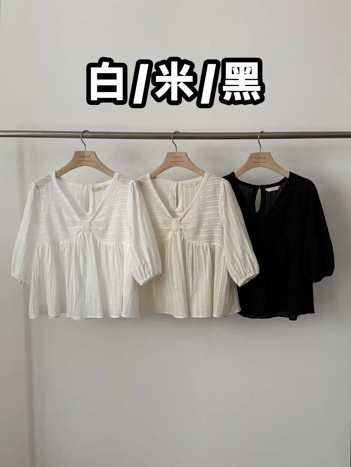 B119捲髮歐膩V領胸抓皺拼接上衣3色
