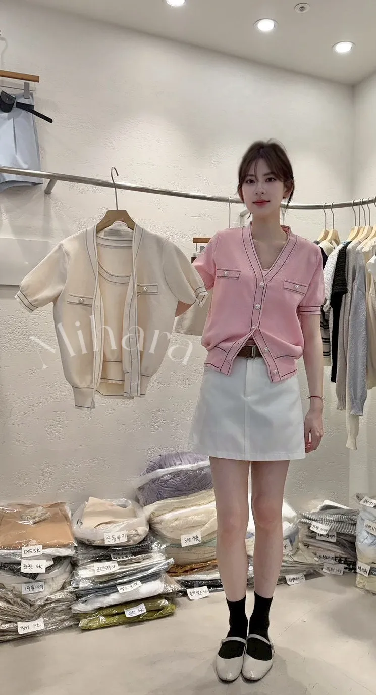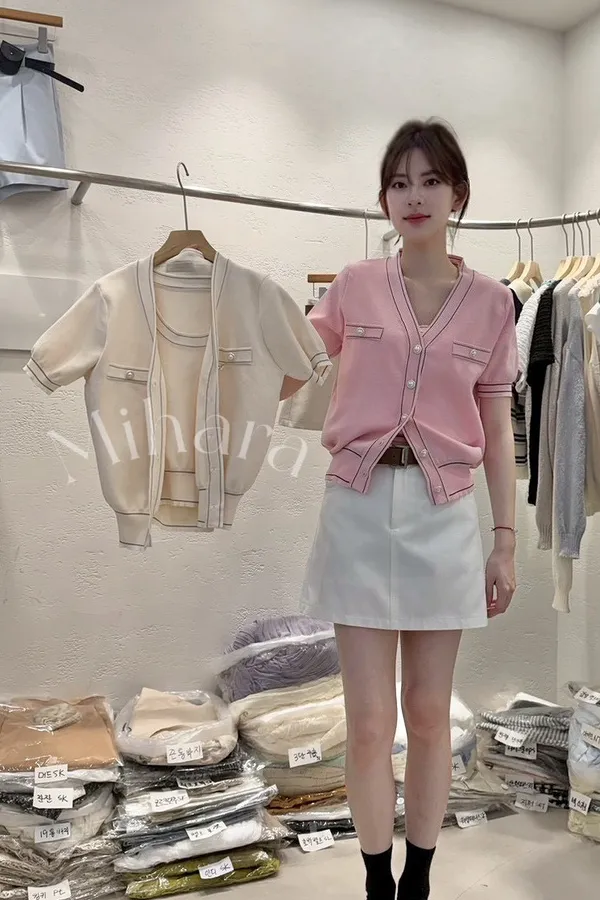 A41 0414甜甜家撞色車線V領針織外套+U領針織背心(SET)2色