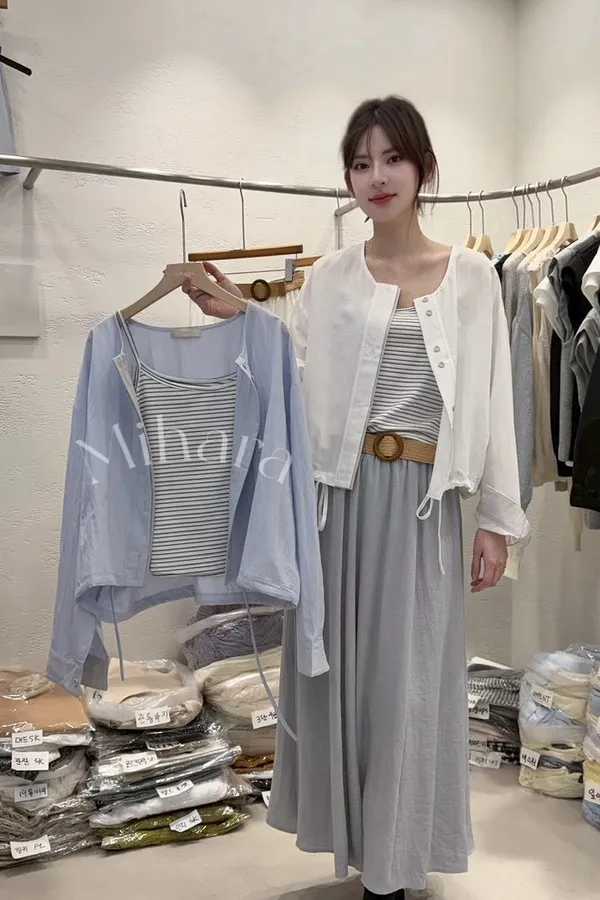 A44 0414甜甜家圓領外套+橫條細肩帶大U領背心(SET)2色