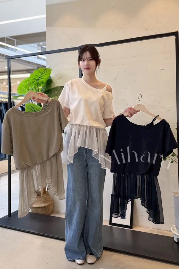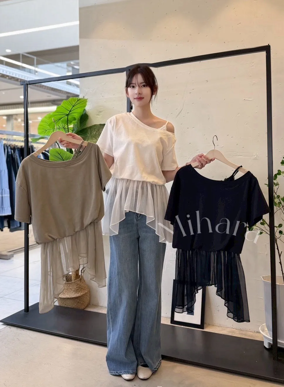 A57 0414CP外套家假兩件拼接蕾絲雪紡斜肩棉質上衣3色