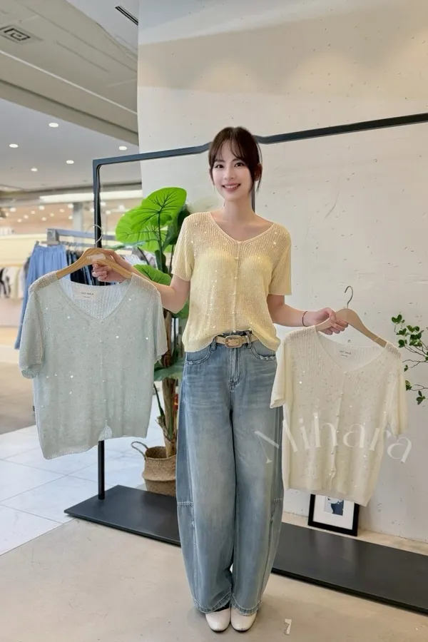 A63 0414CP外套家亮片V領棉麻針織衫3色
