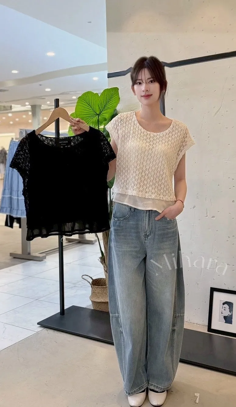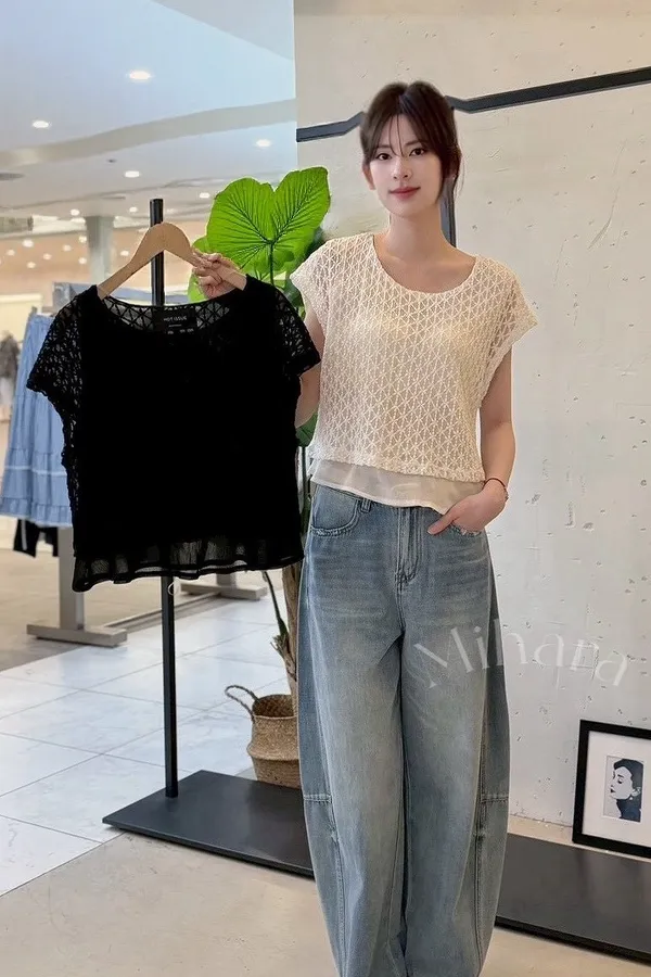 A67 0414CP外套家假兩件蕾絲U領雪紡上衣2色