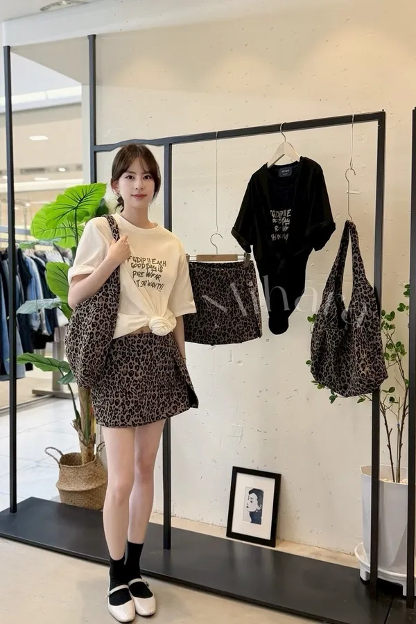 A75 0414CP外套家英文字母扭結圓領T+豹紋短褲裙+豹紋大包包(SET)2色