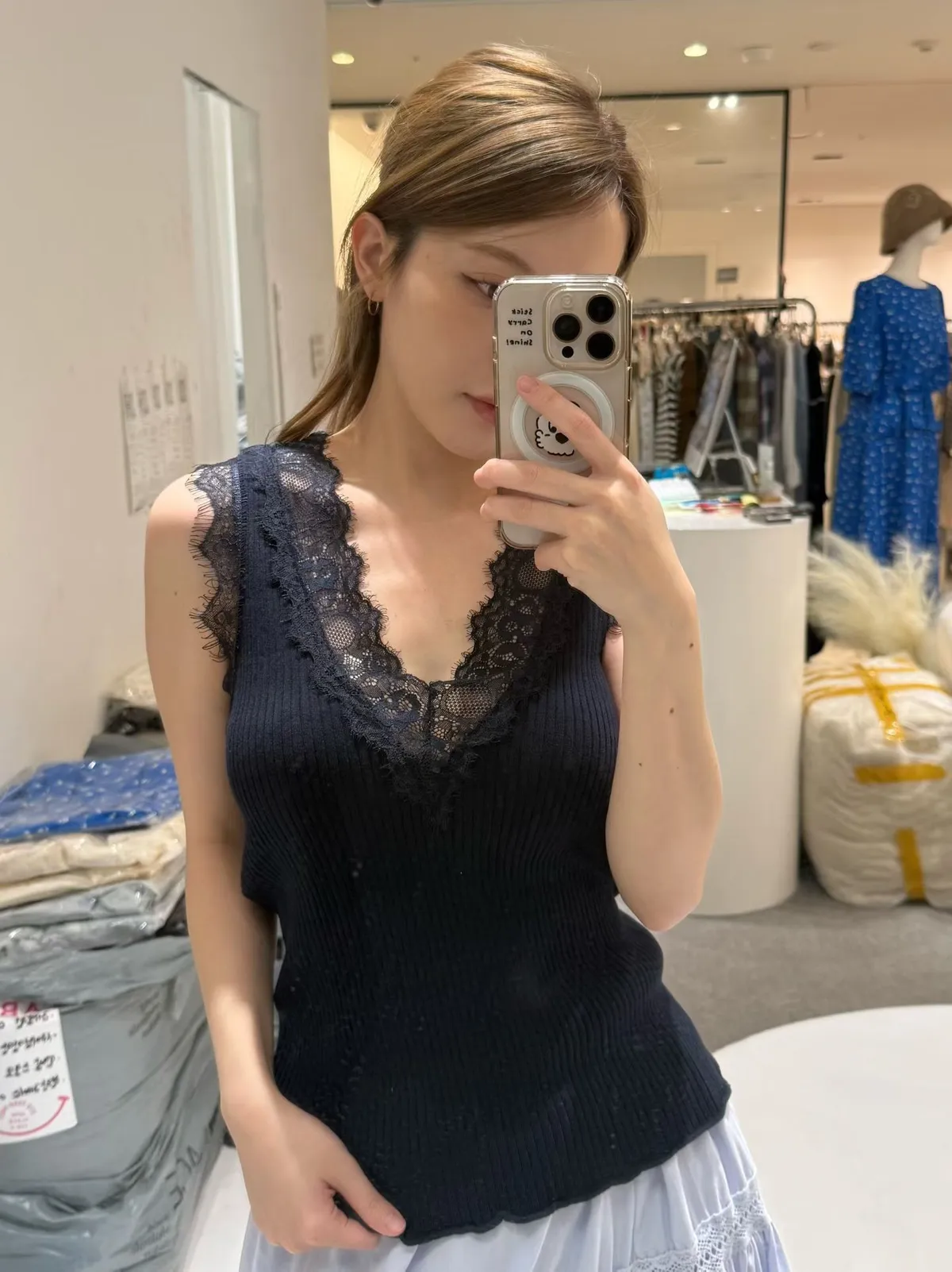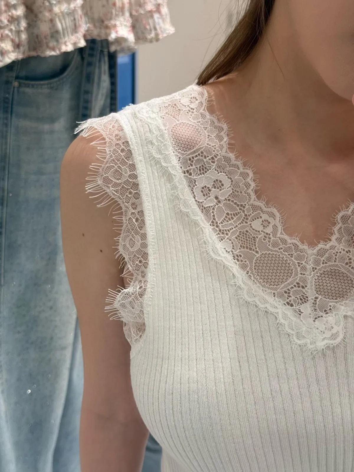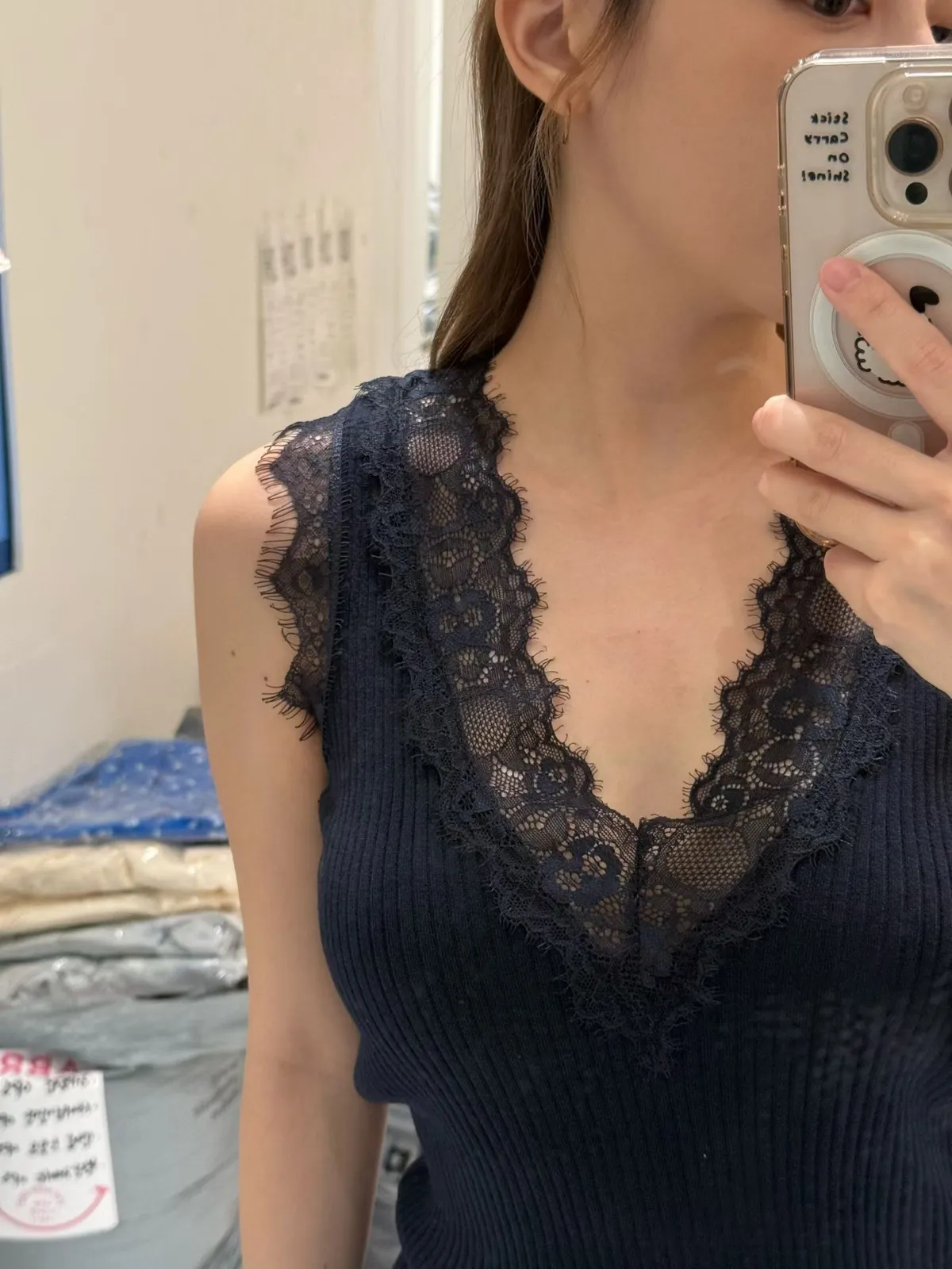 A1 0416美美設計家蕾絲V領坑條小背心3色