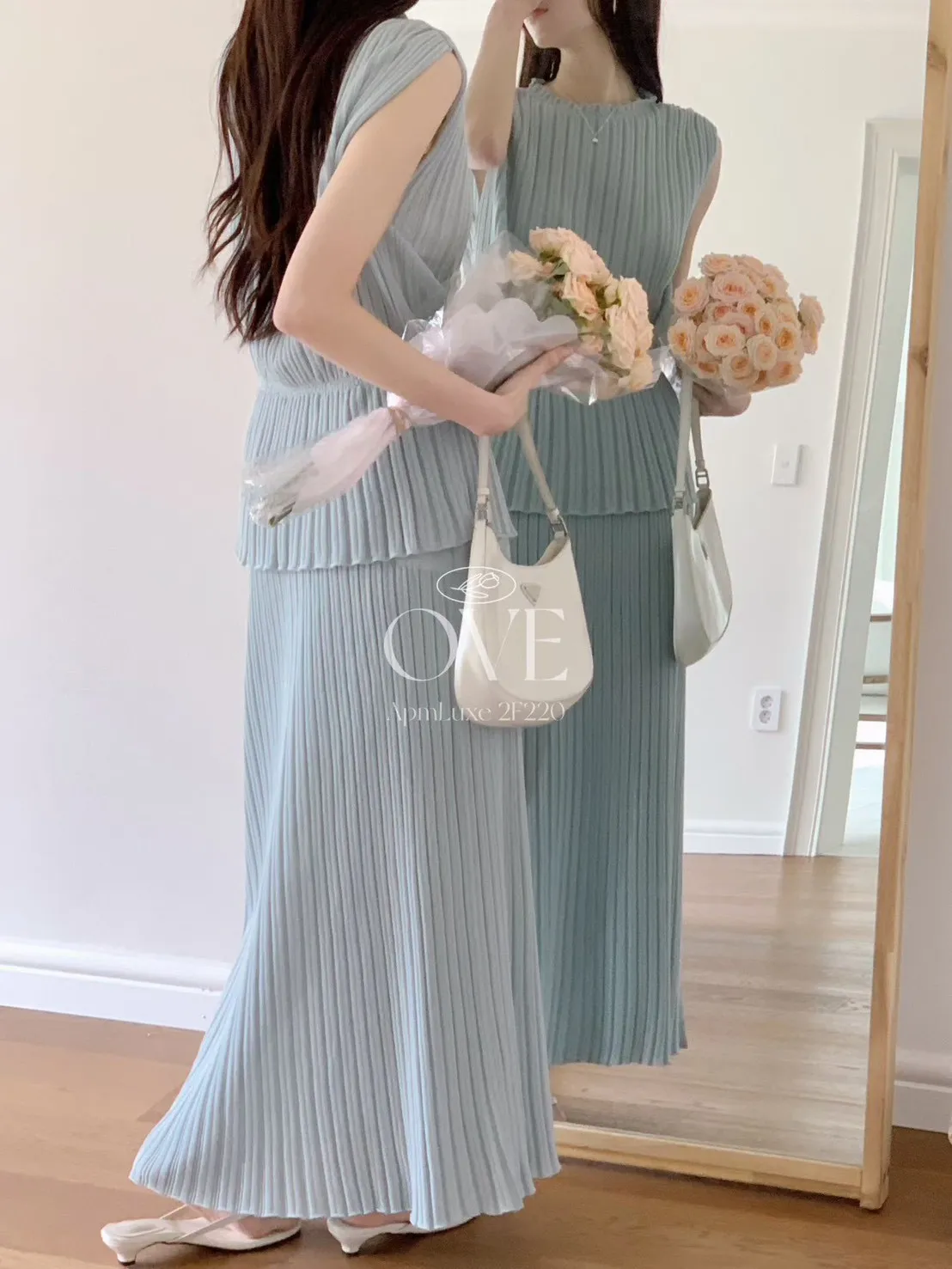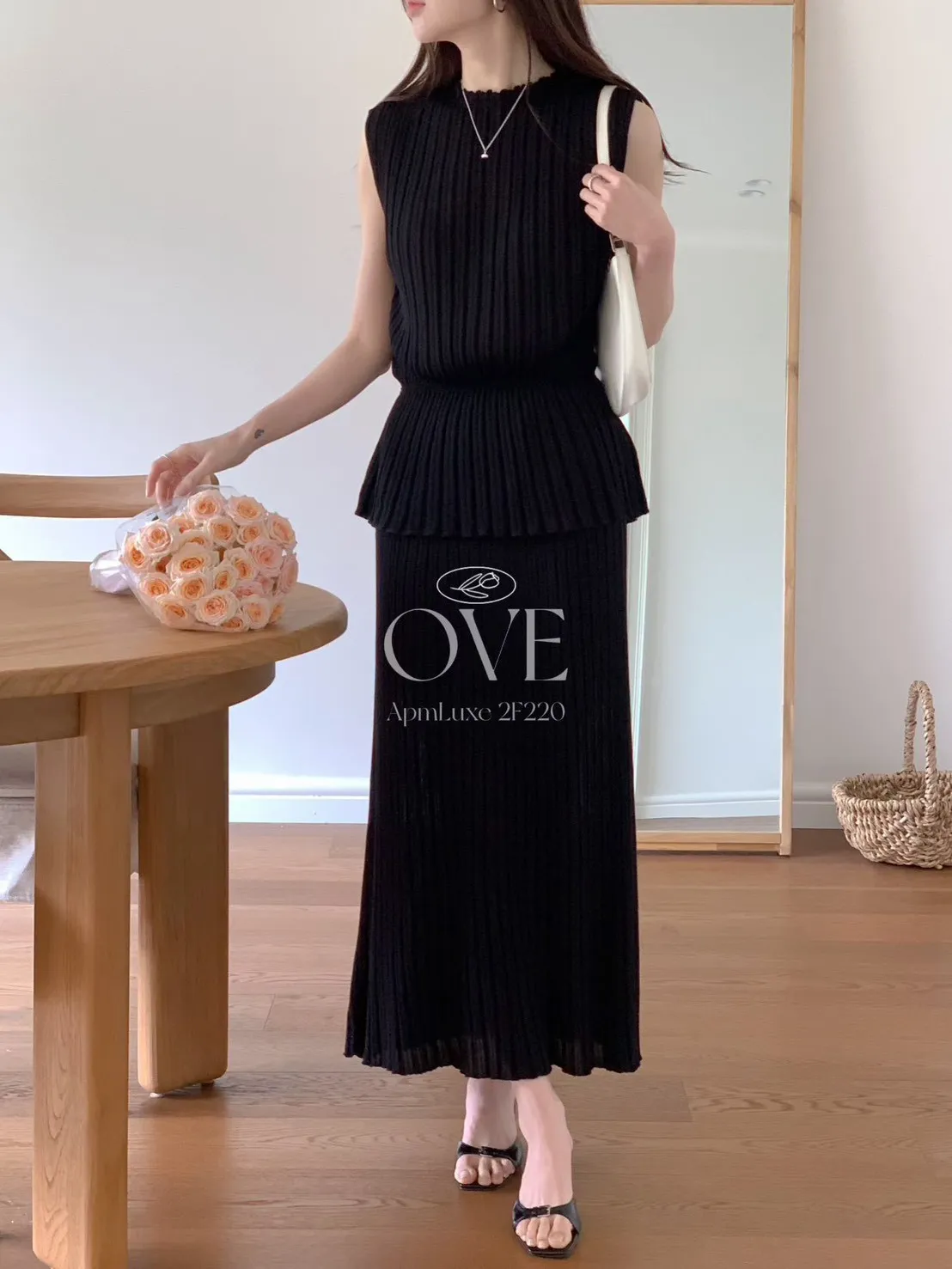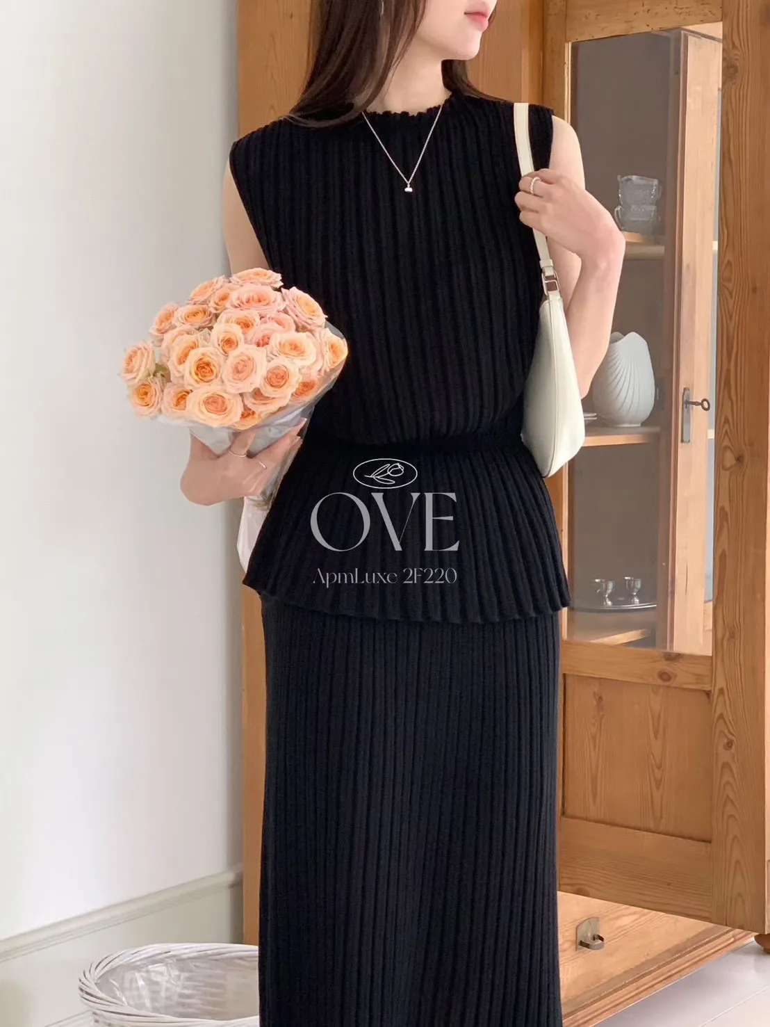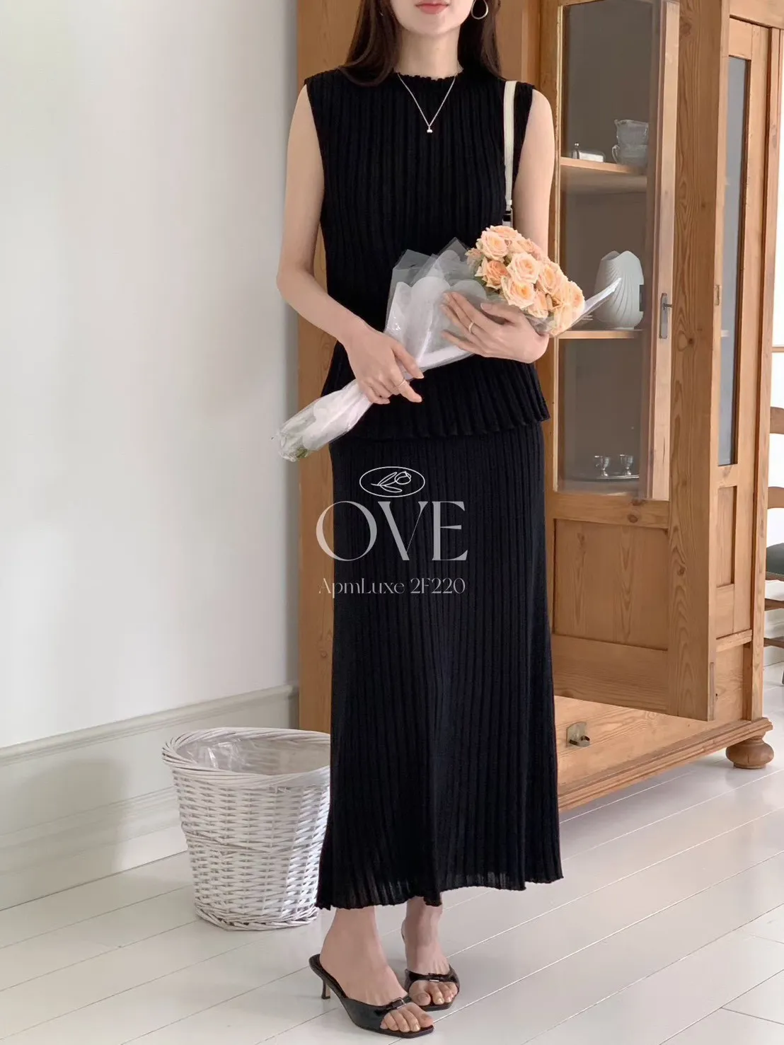 A3 0419高檔浪漫洋裝家直紋圓領針織衫+直紋針織半裙(SET)3色