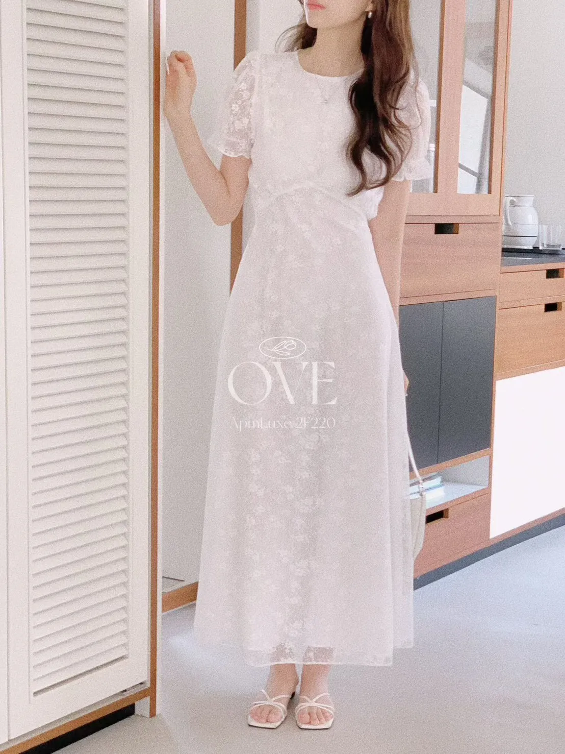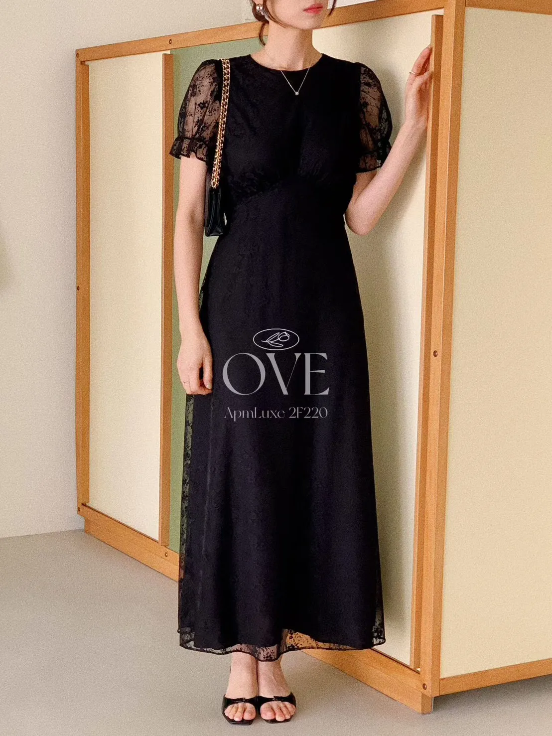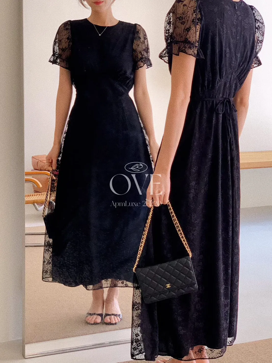 A4 0419高檔浪漫洋裝家綁帶圓領雕花蕾絲洋裝2色