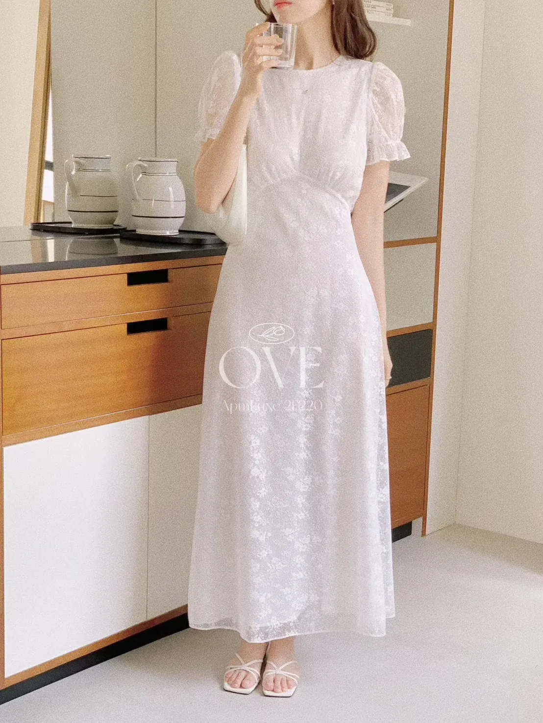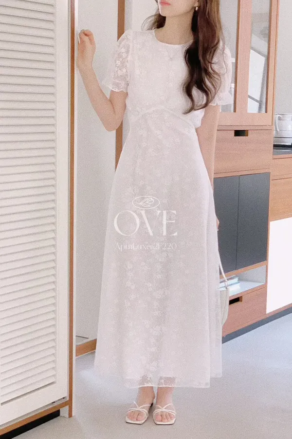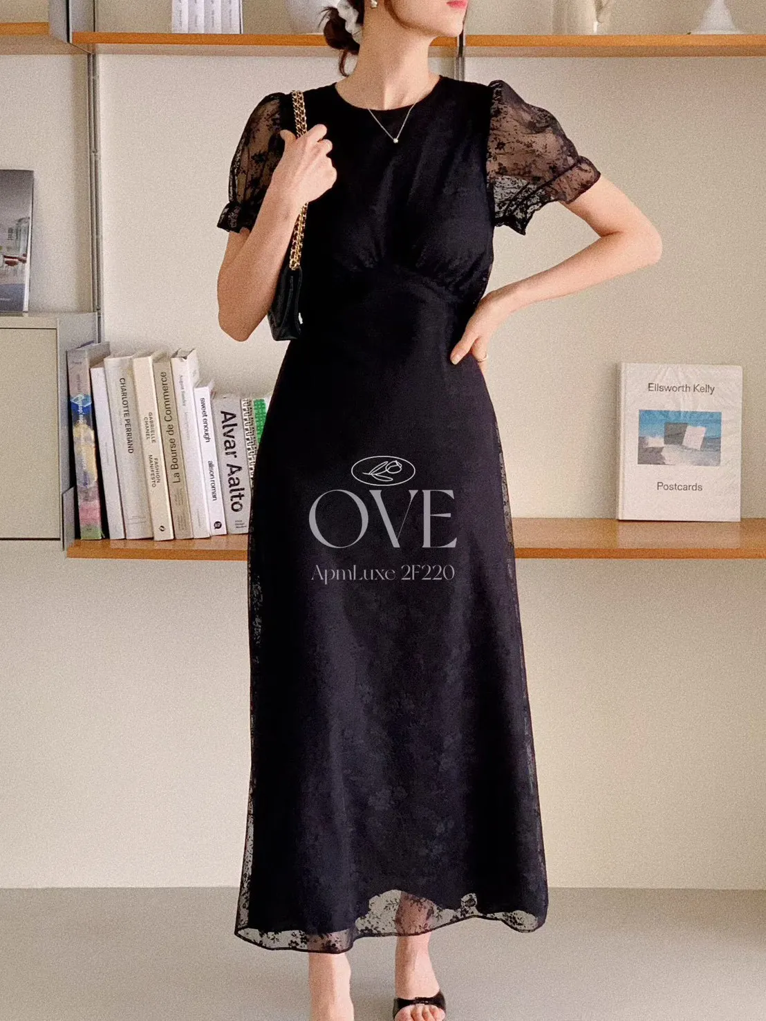 A4 0419高檔浪漫洋裝家綁帶圓領雕花蕾絲洋裝2色