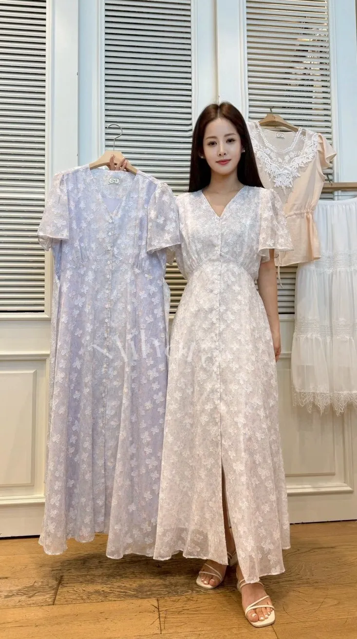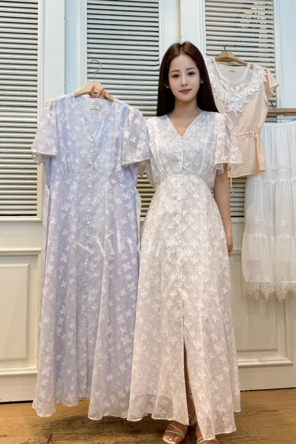 A14 0419高檔浪漫洋裝家綁帶排釦V領銀蔥碎花雪紡洋裝2色
