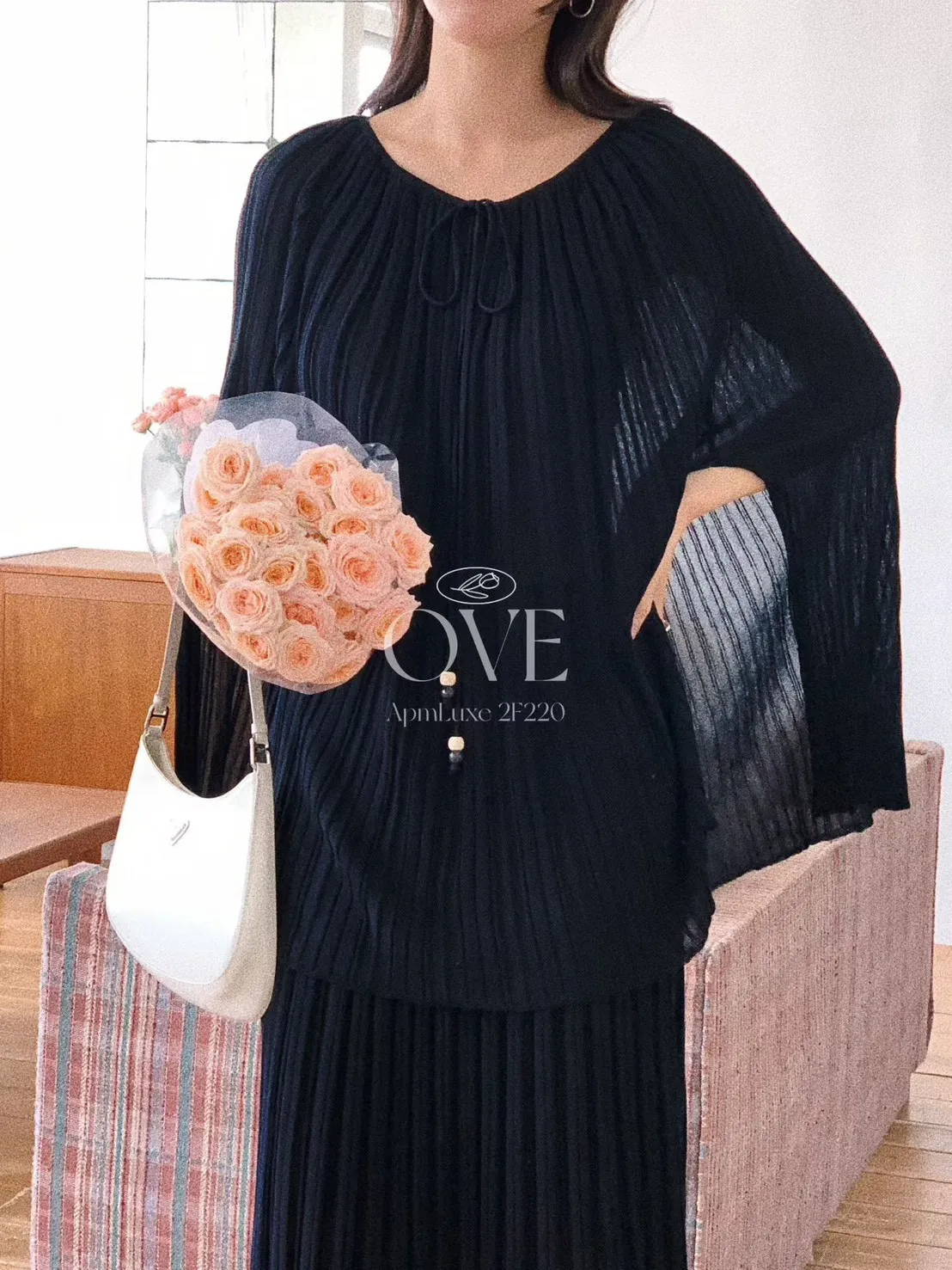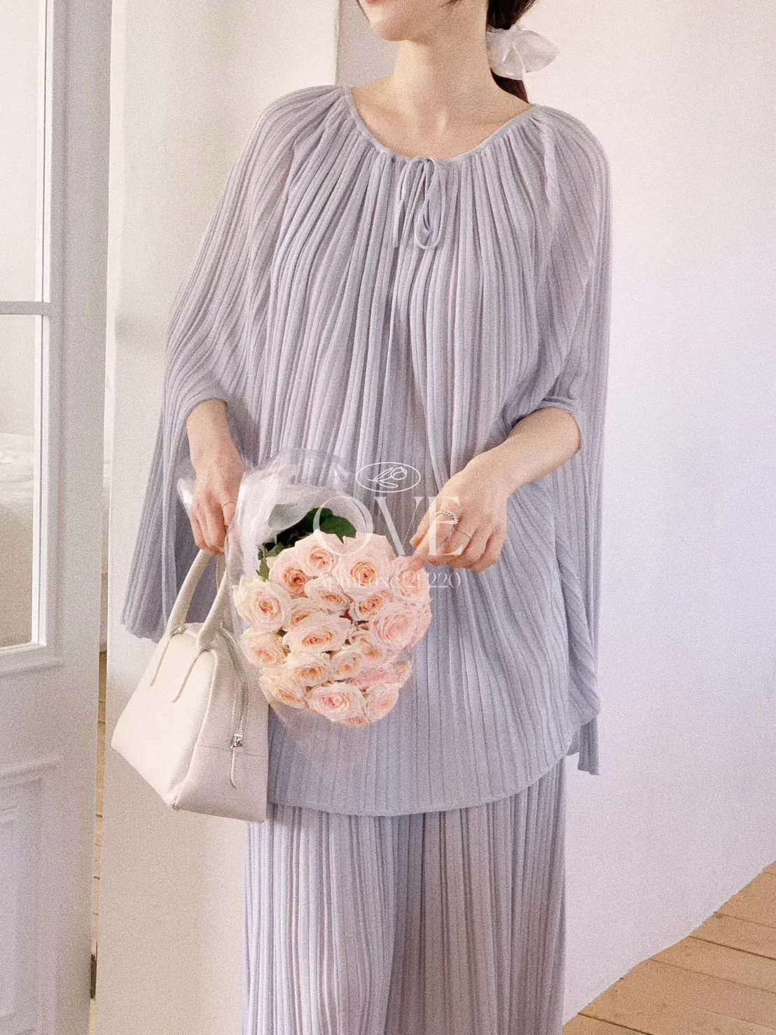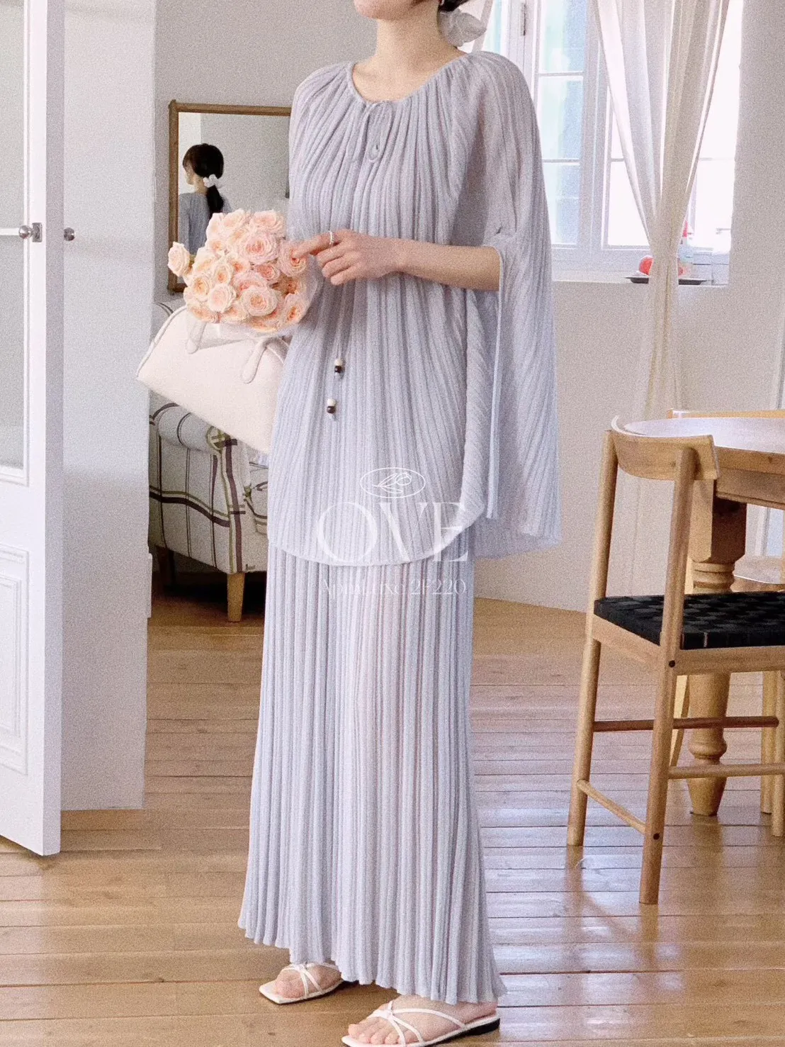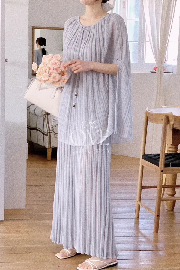 A20 0419高檔浪漫洋裝家綁帶小V領百褶斗篷上衣+百褶半裙(SET)2色
