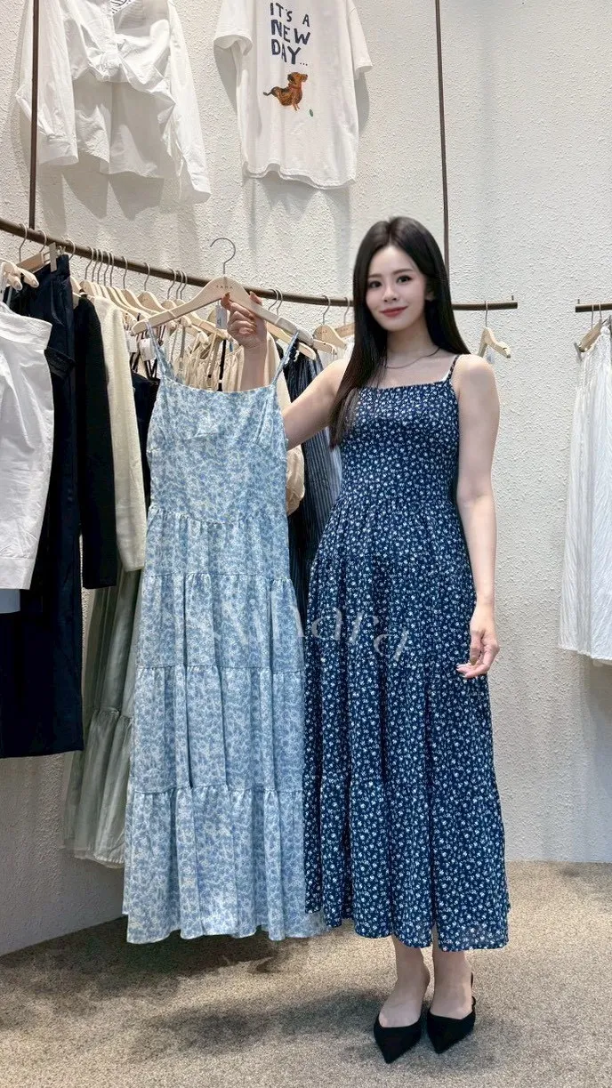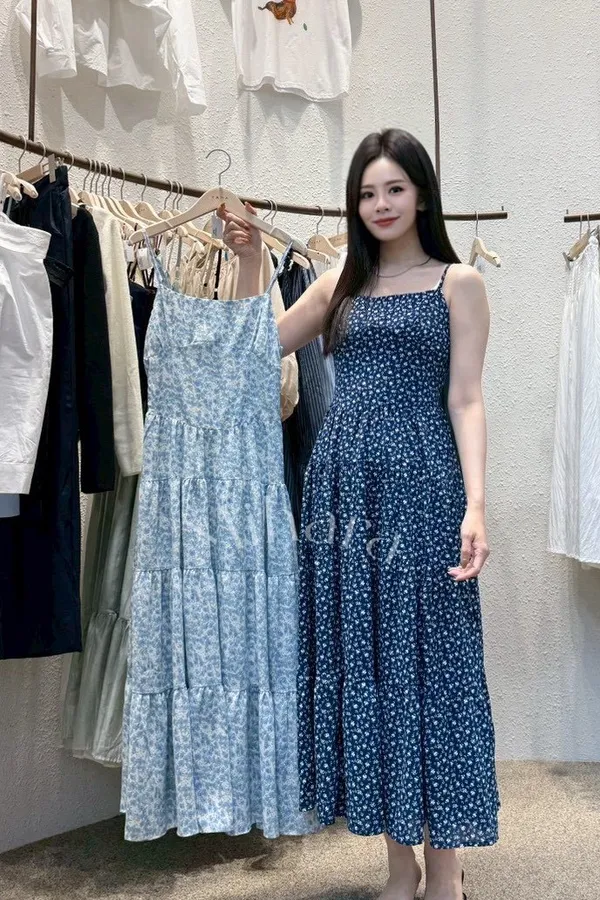 A29 0419細肩帶平口蛋糕裙碎花雪紡背心洋裝2色