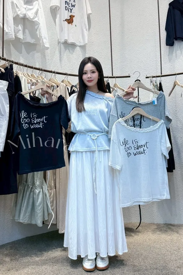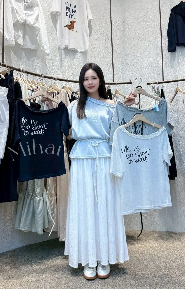 A30 0419英文字母斜肩上衣附綁帶4色