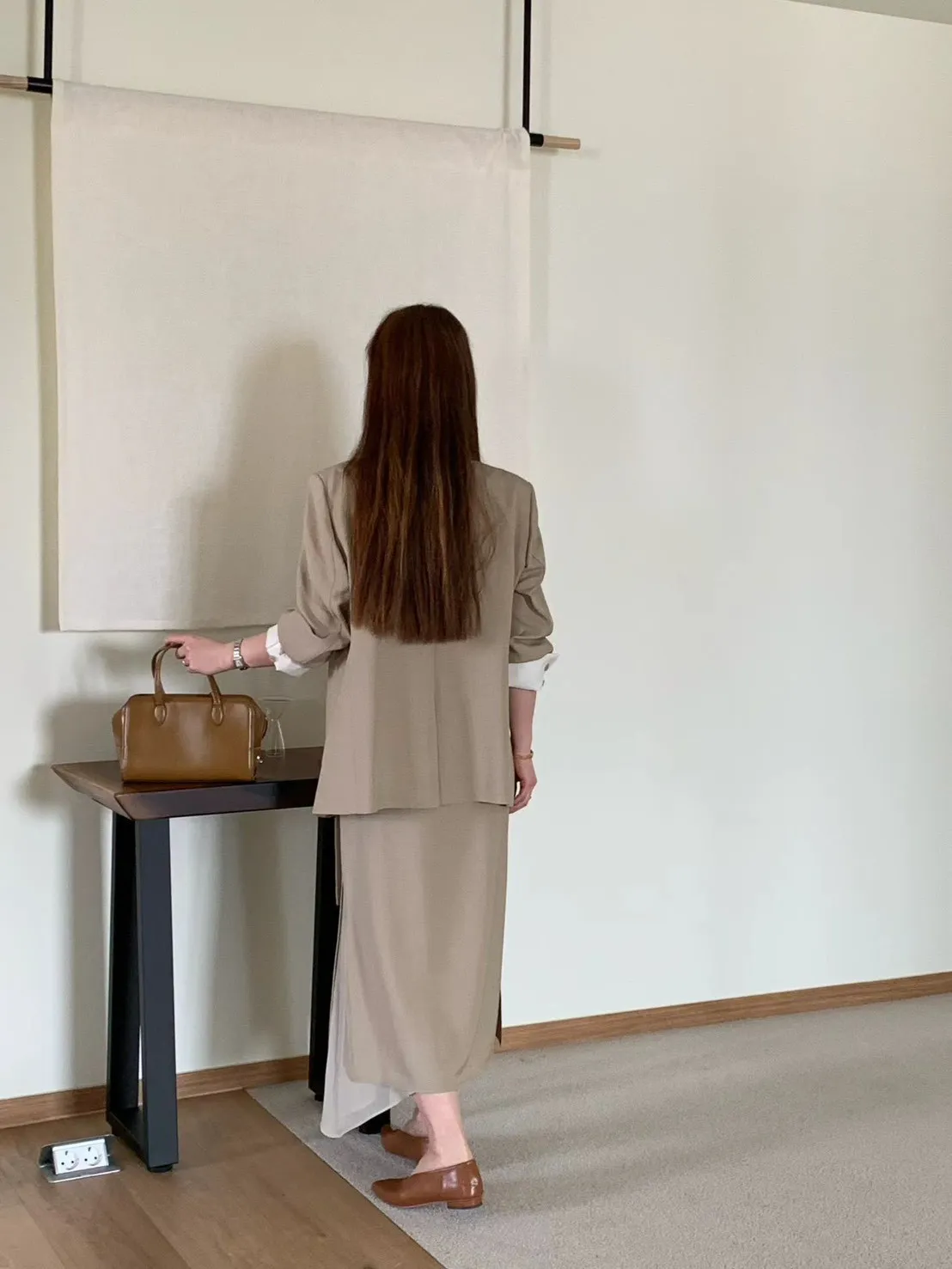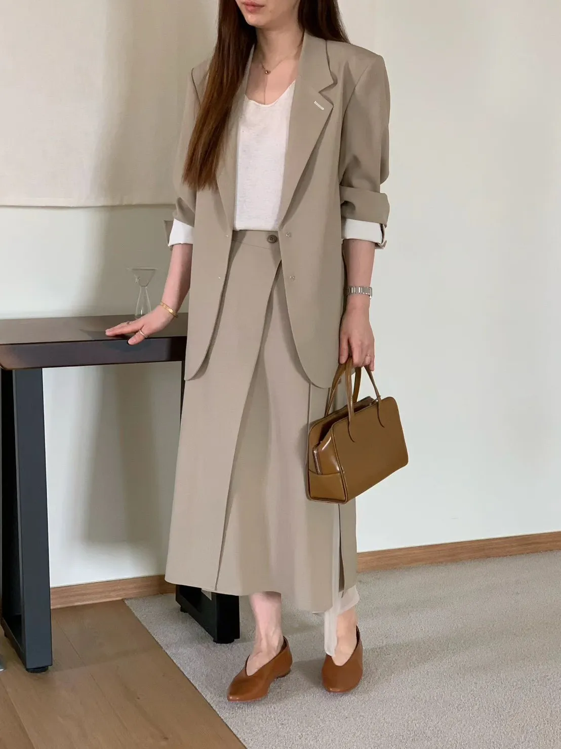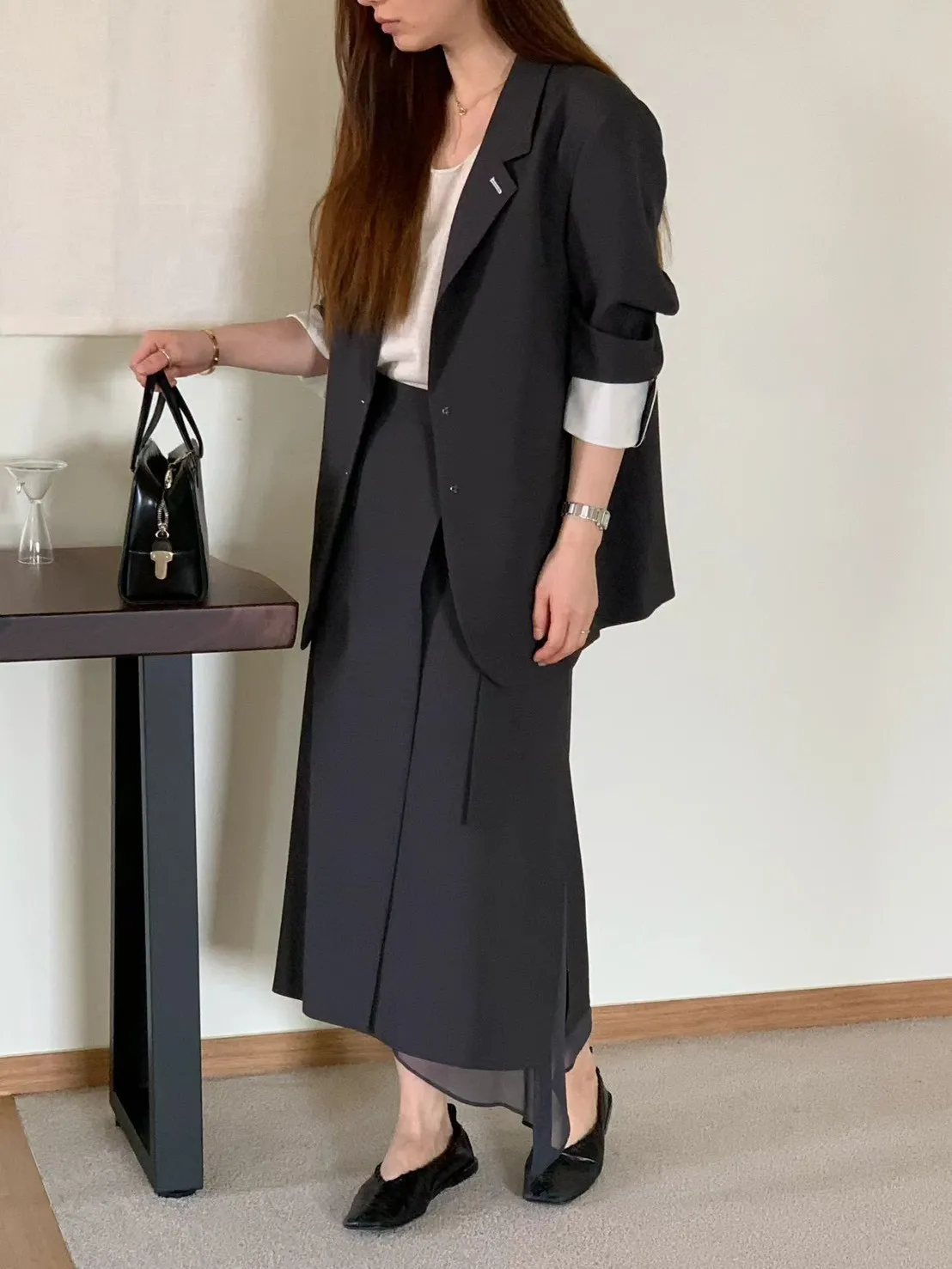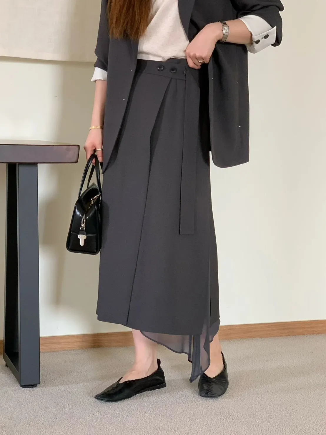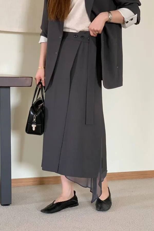 A12 0421氣質歐膩家開衩透紗西裝半裙2色(S/M/L)
