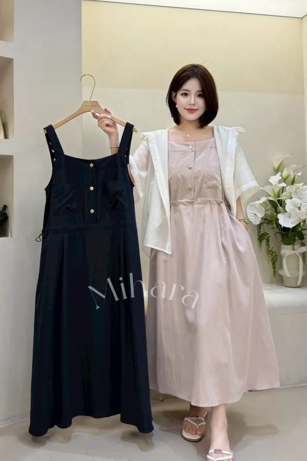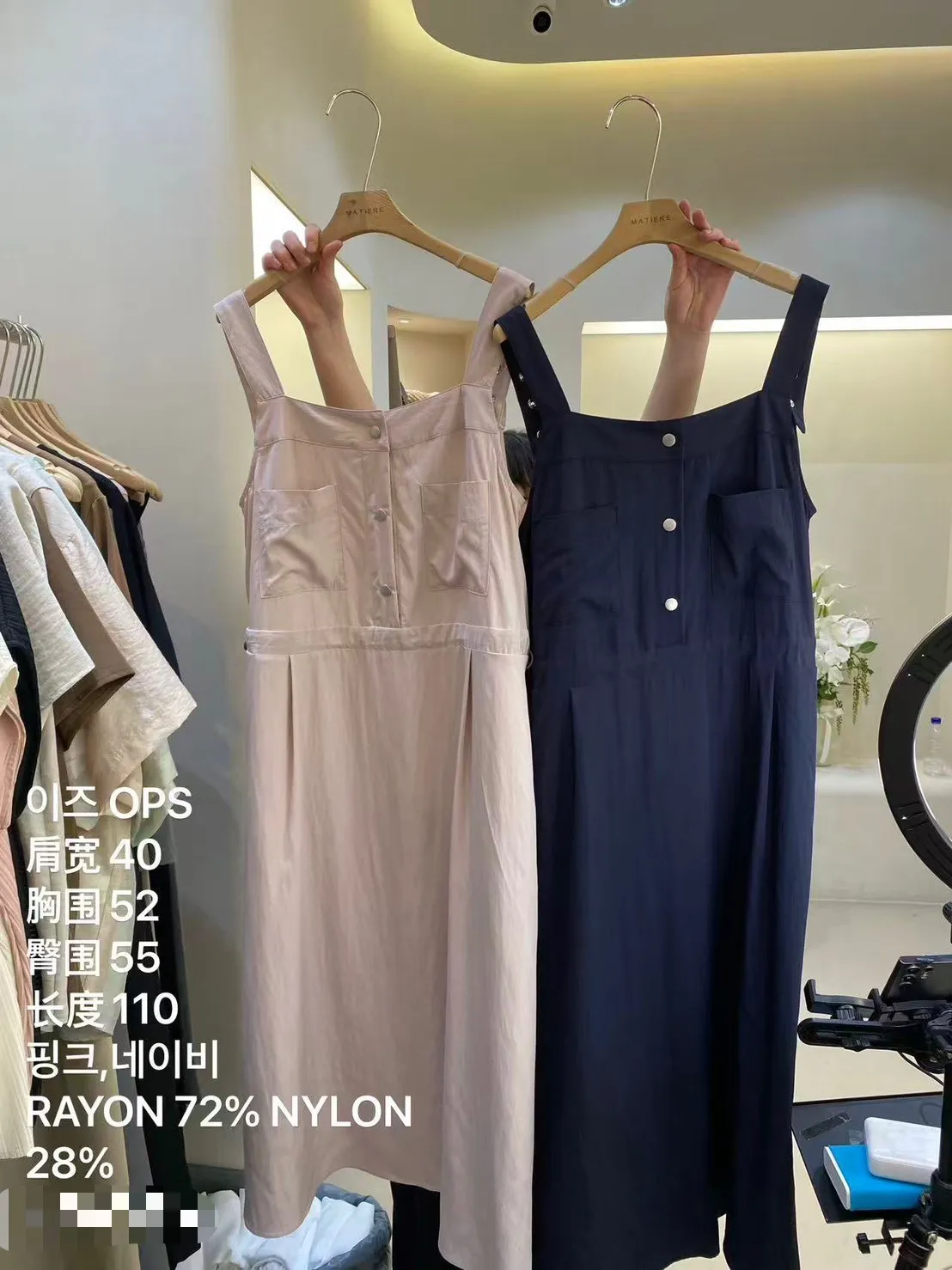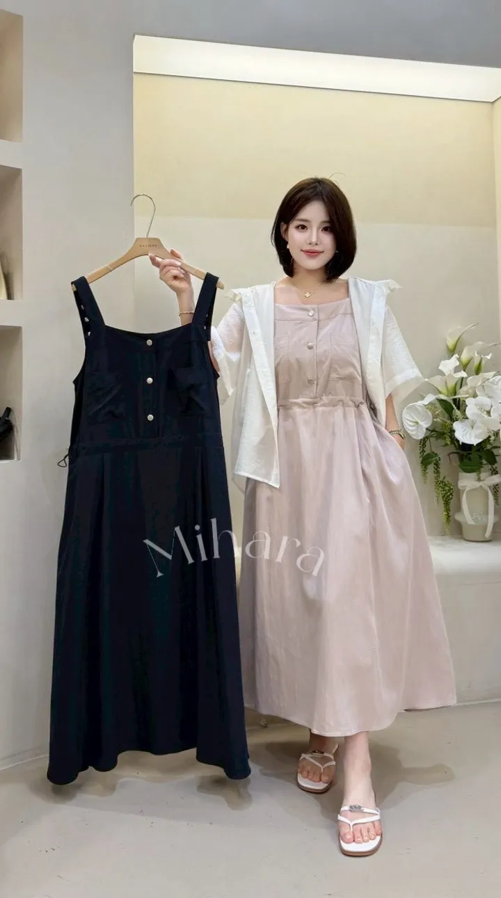 A46 0422可愛歐膩家人造絲寬肩帶方領背心洋裝2色