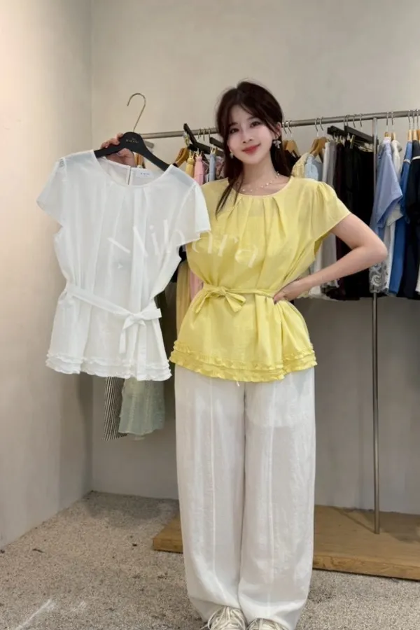 A20 0426浪漫新廠家雙層荷葉下擺立體壓褶綁帶圓領上衣2色
