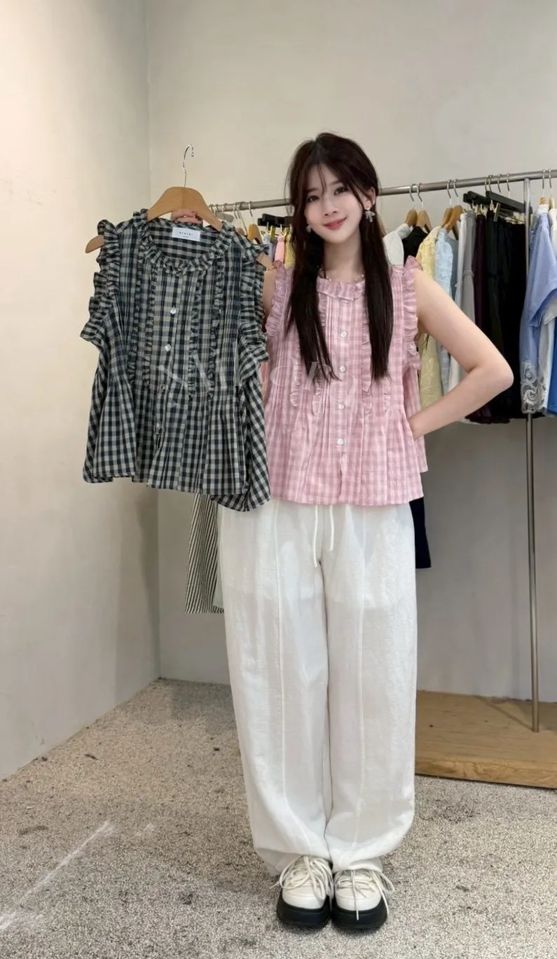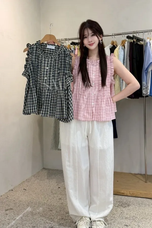 A23 0426浪漫新廠家荷葉邊格紋圓領娃娃背心2色
