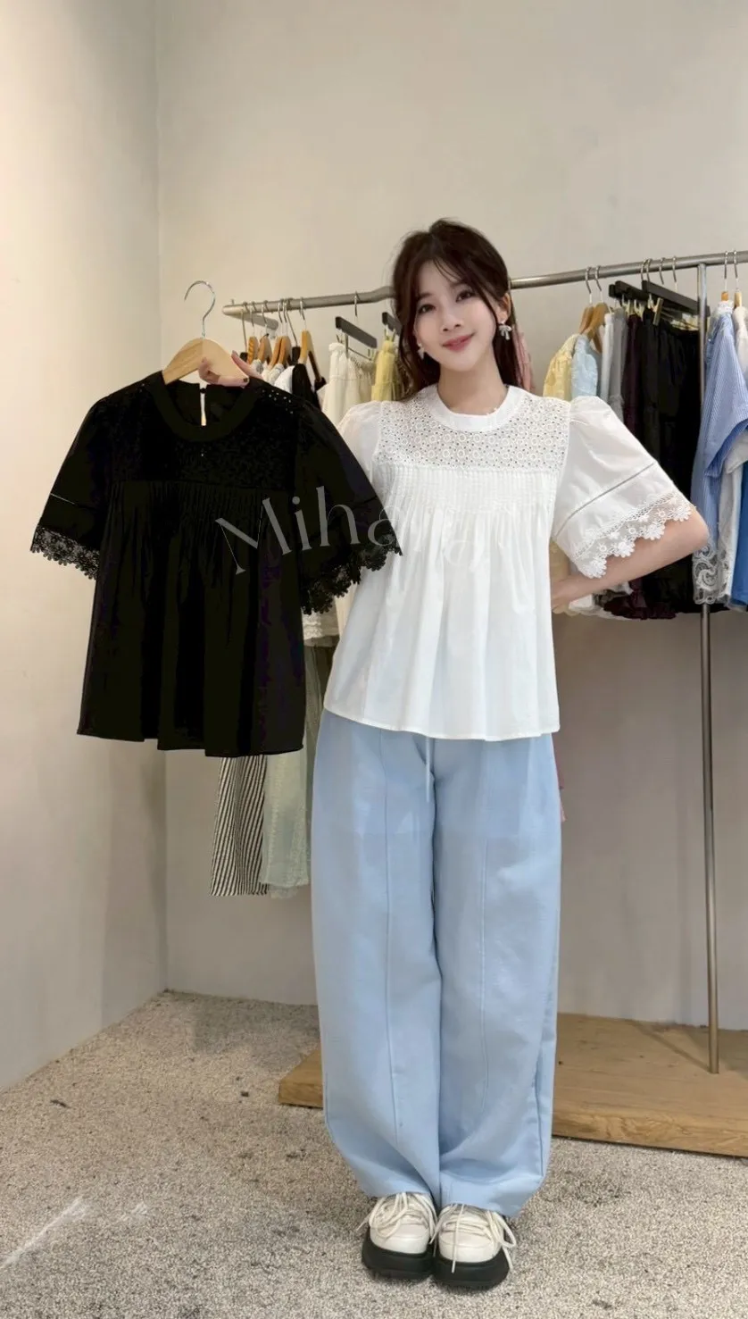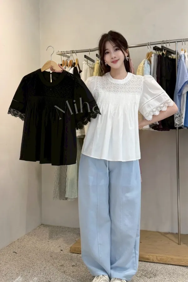 A25 0426浪漫新廠家拼接蕾絲刺繡圓領娃娃上衣2色